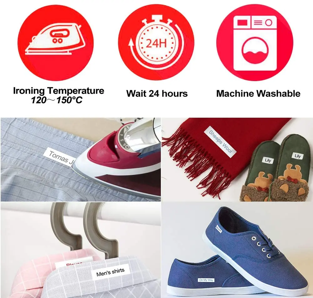 Примечания: о выпадении: сначала закрепите четыре угла этикетки утюгом при глажке, потому что четыре угла легче всего наклонять. Проглаженная этикетка должна быть размещена за 24 часа до того, как ее можно постирать. При глажке гладильная доска должна быть проложена так, чтобы клей мог проникнуть в заднюю наклейку, чтобы сделать этикетку более прочной. Не используйте очень жесткий коврик. О цвете печати