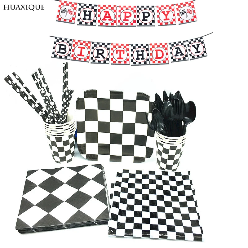 Черный, белый цвет решетки воздушные шары тема гоночный автомобиль вечерние набор одноразовой посуды Бумага пластины чашки День рождения вечерние украшения поставки