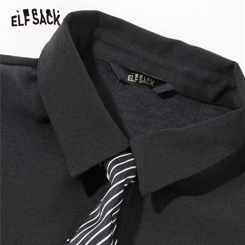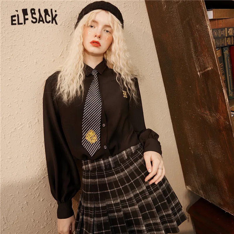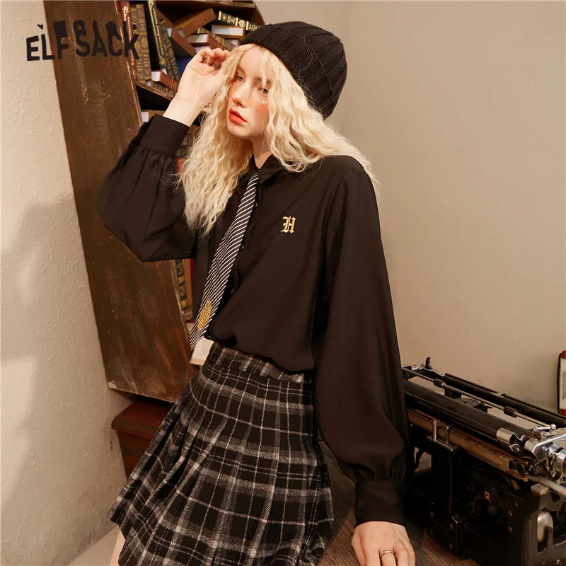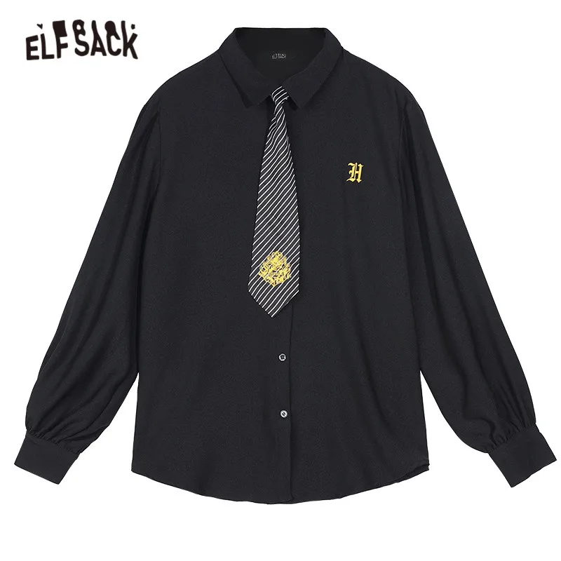 Женские однобортные повседневные рубашки ELFSACK, черные однобортные рубашки с вышивкой спереди, Осенний топ с длинными рукавами ELF в Корейском стиле 2020