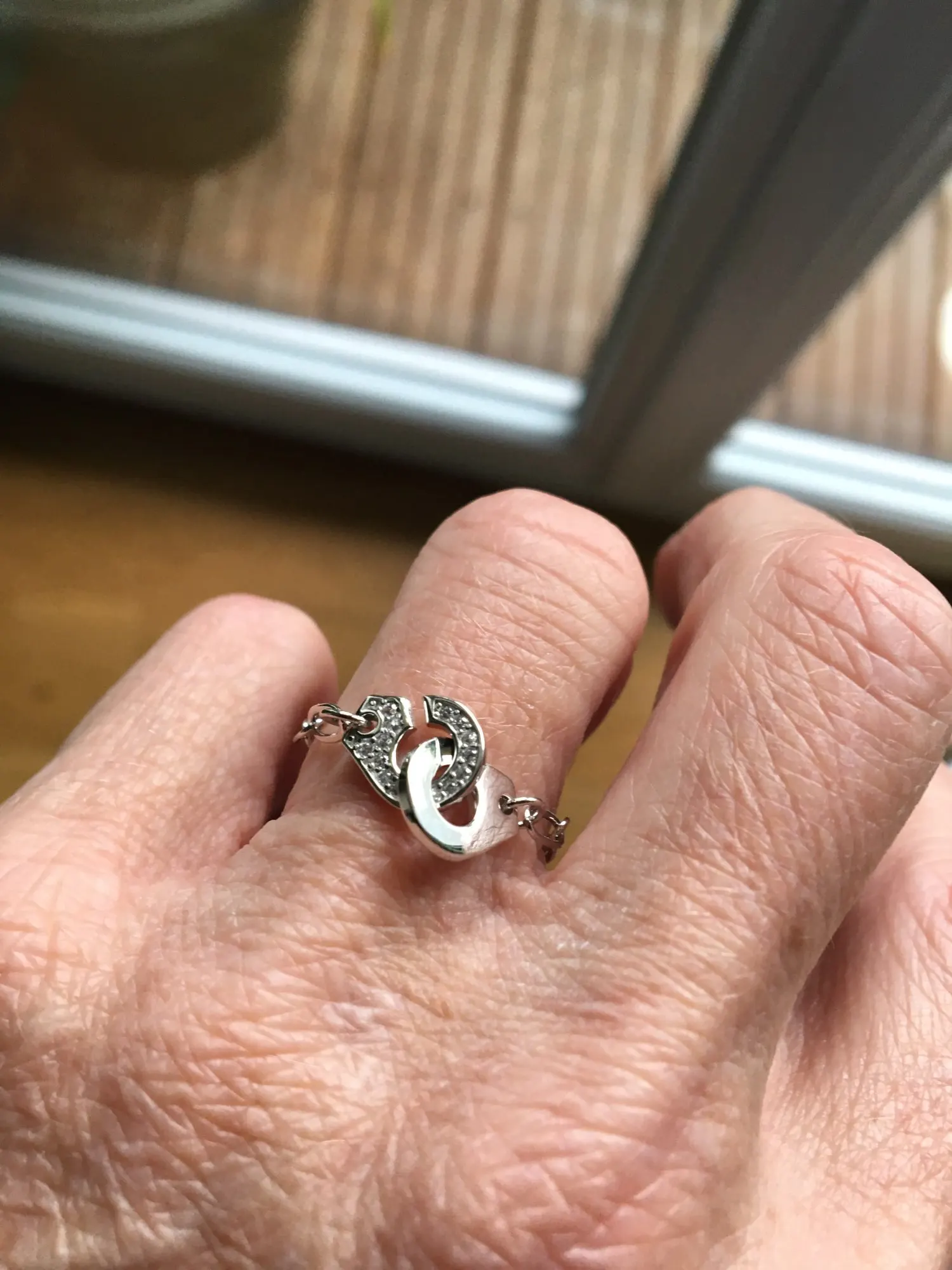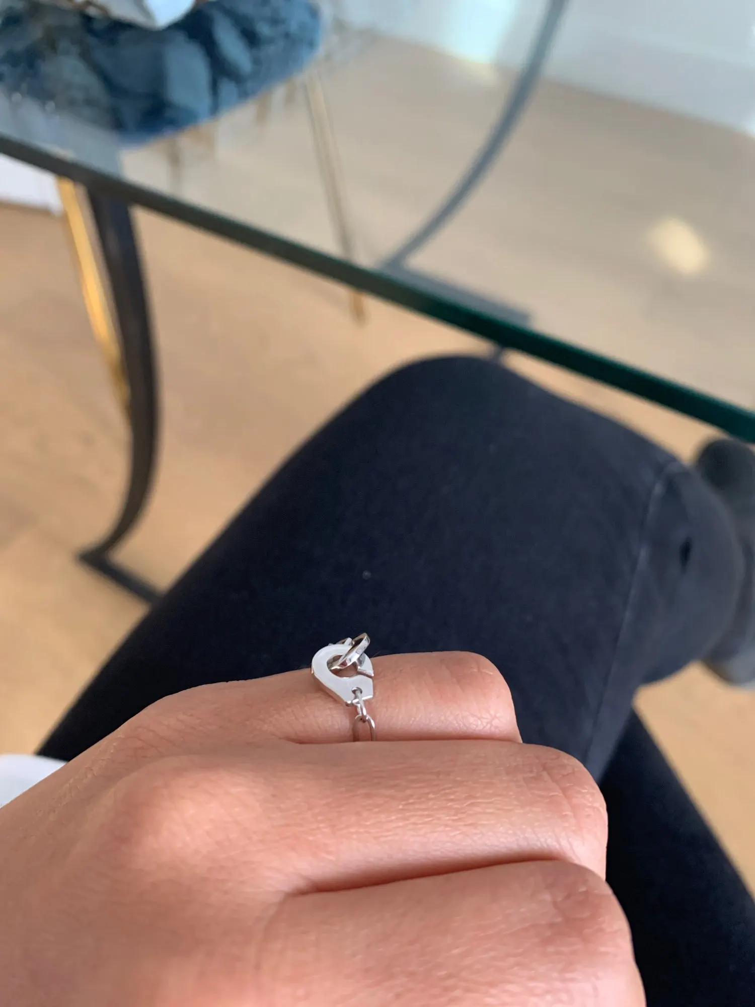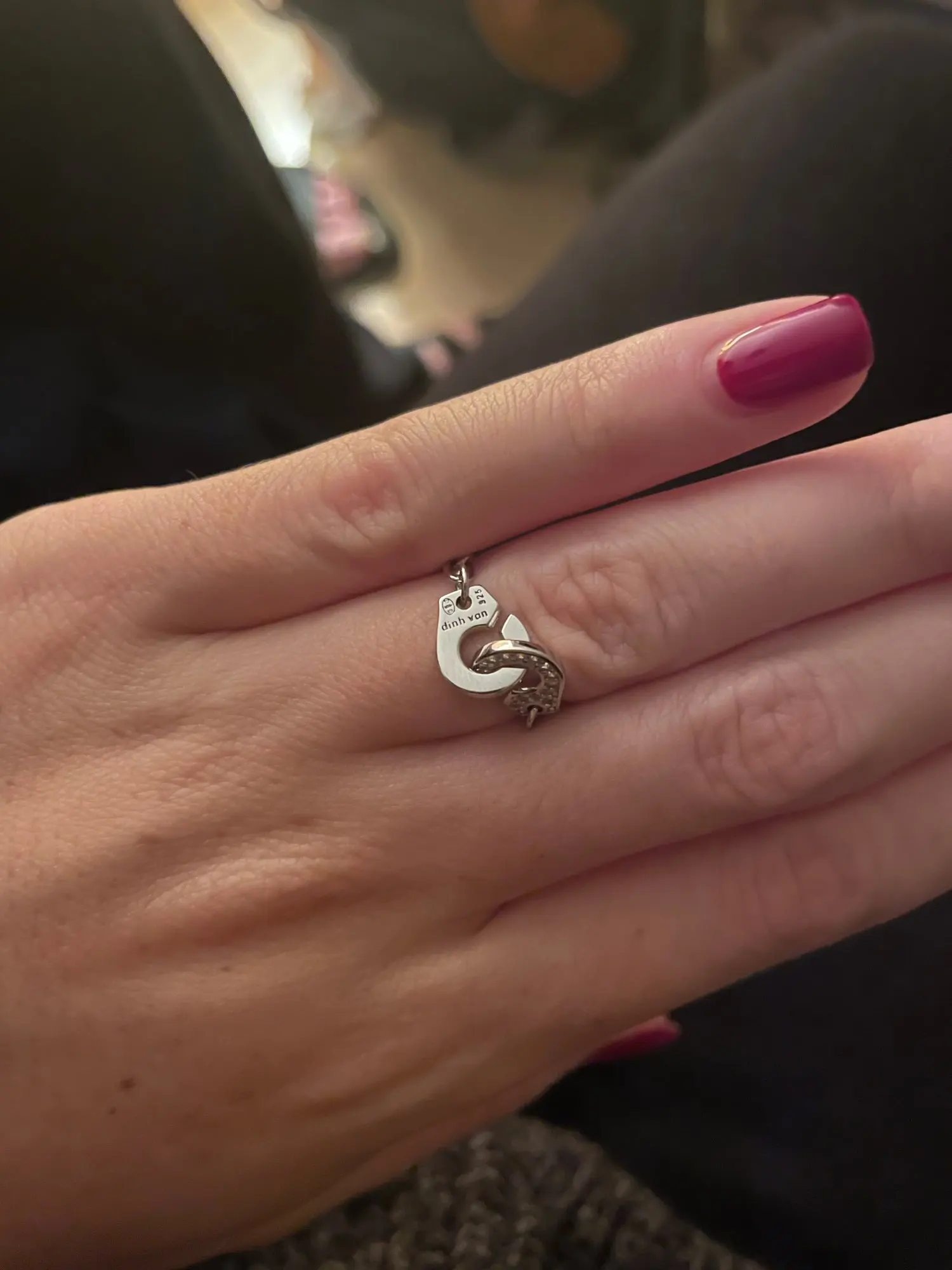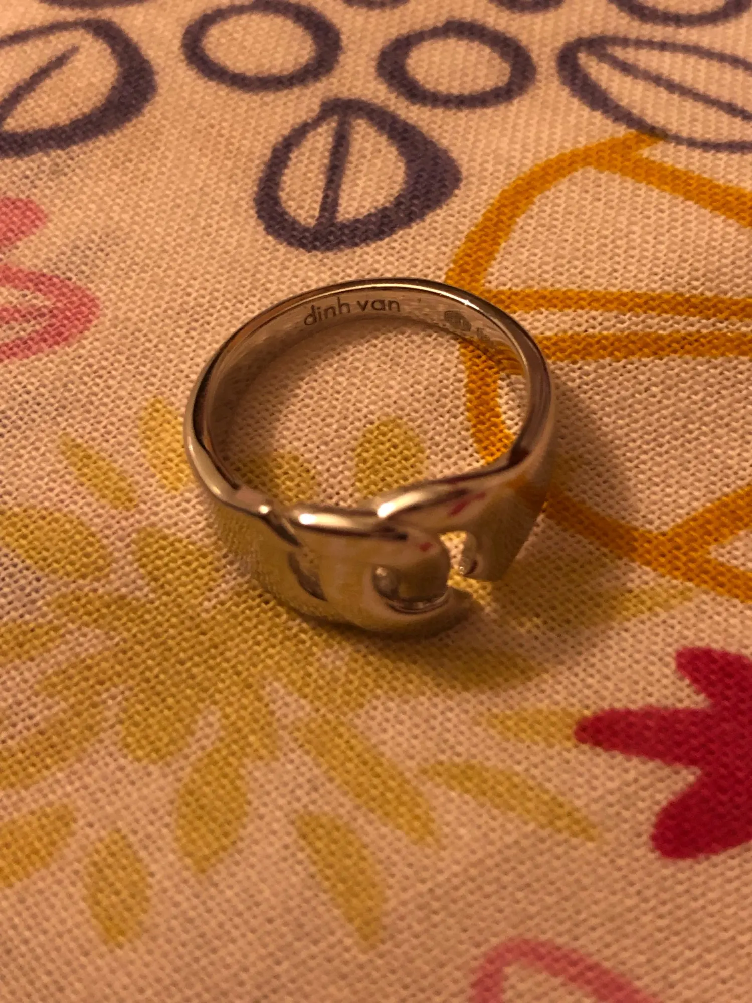 Очень красивое блестящее металлическое кольцо, съемная нить, надпись Messika выгравирована внутри кольца. И размер, соответствующий моим тонким пальцам.