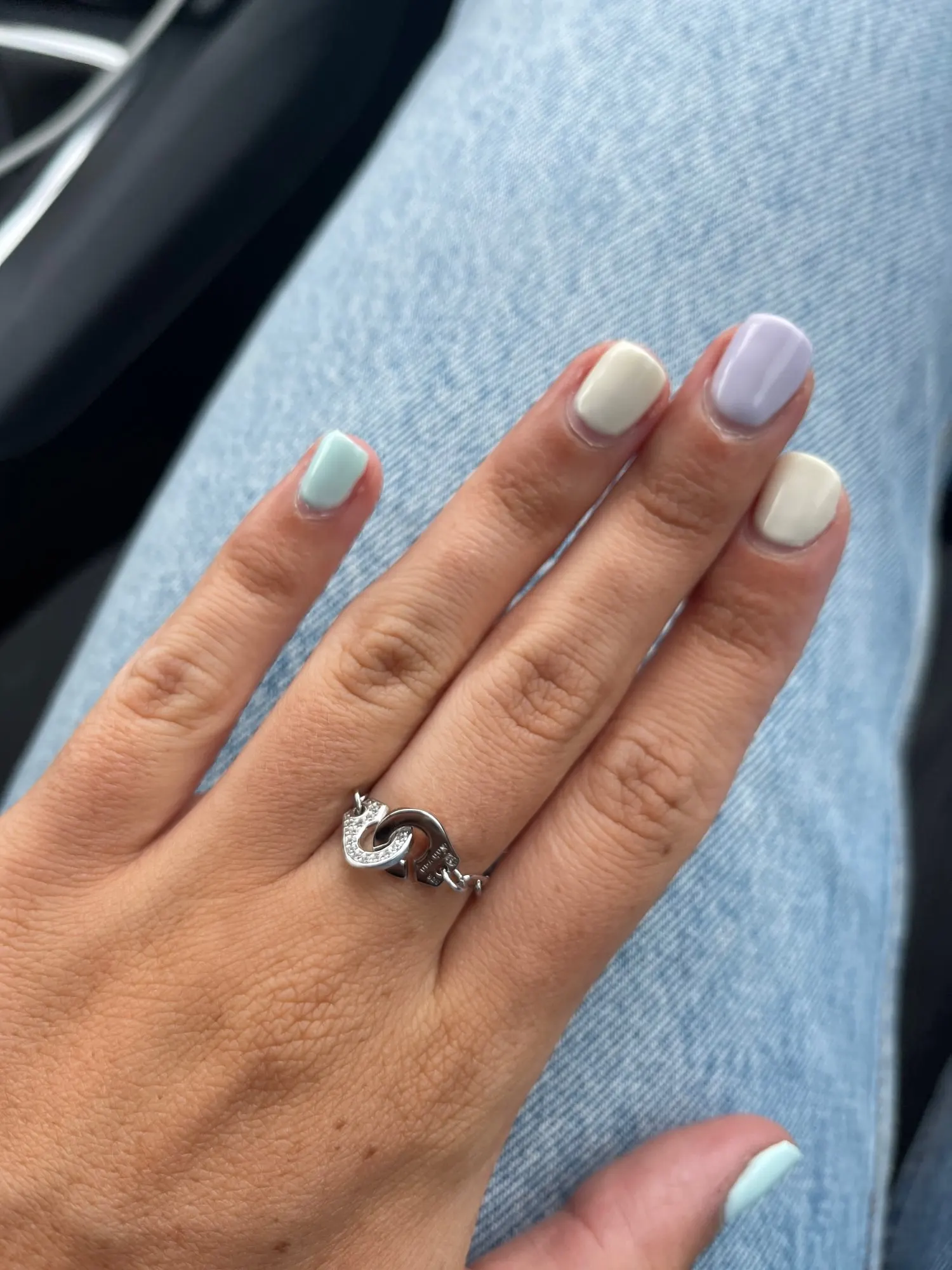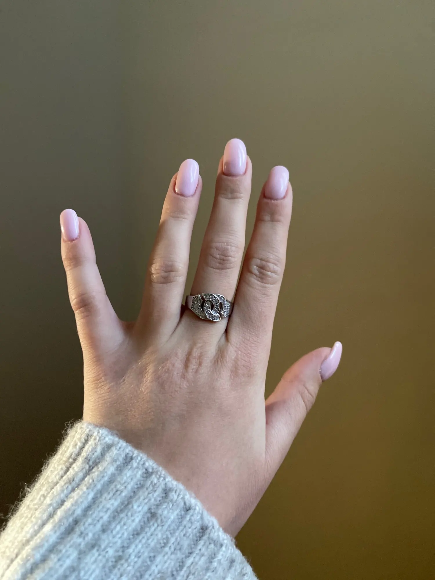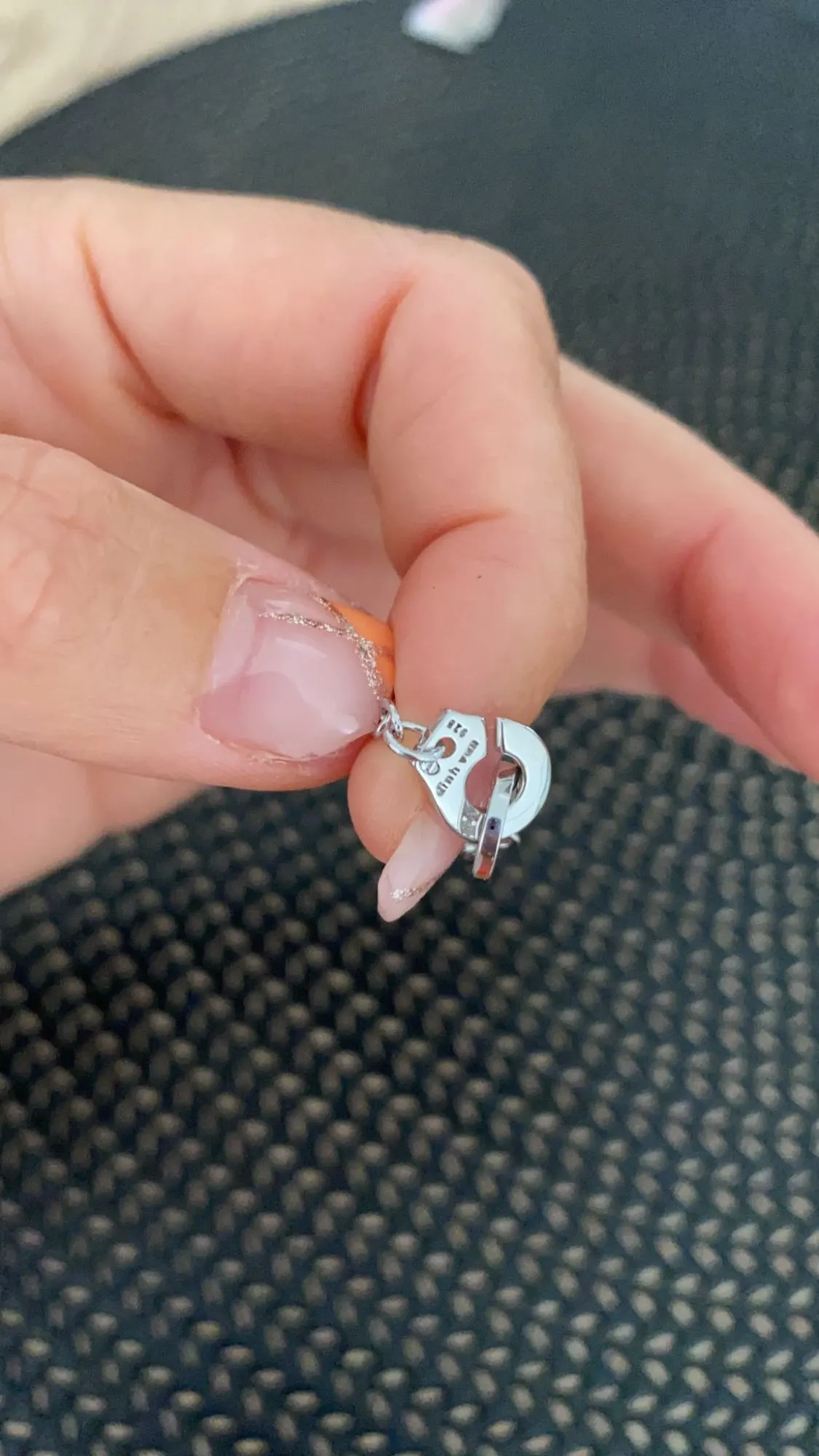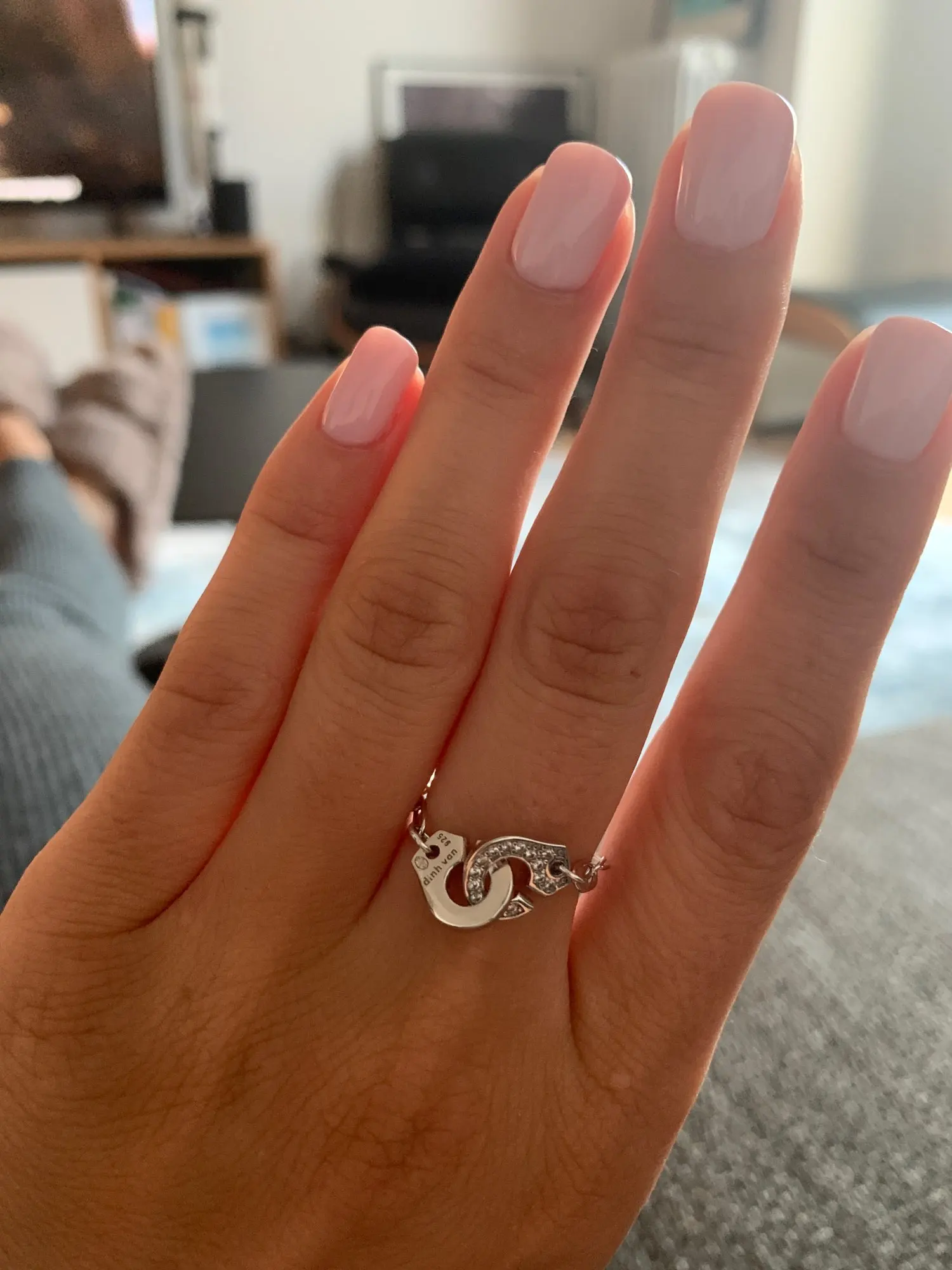 Очень красивое блестящее металлическое кольцо, съемная нить, надпись Messika выгравирована внутри кольца. И размер, соответствующий моим тонким пальцам.