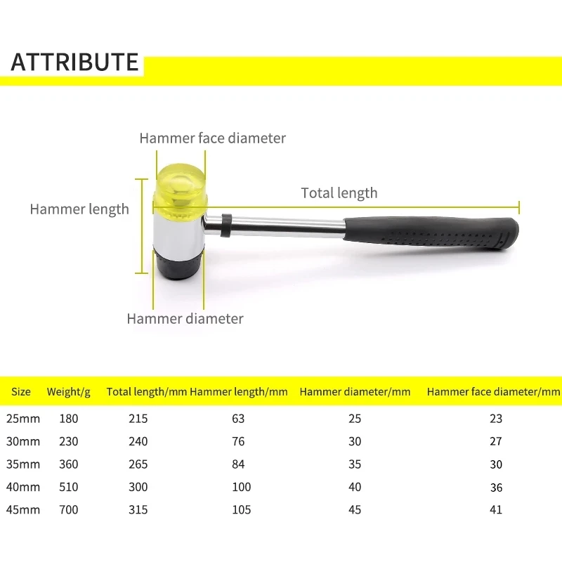 Часть желтой головки молотка была изготовлена из мягкого и прозрачного полиуретана. Черная часть изготовлена из высококачественной стали, устойчивой к нарезанию резьбы, противоскользящей, масляной, можно заменить молотком в соответствии с вашими различными требованиями.