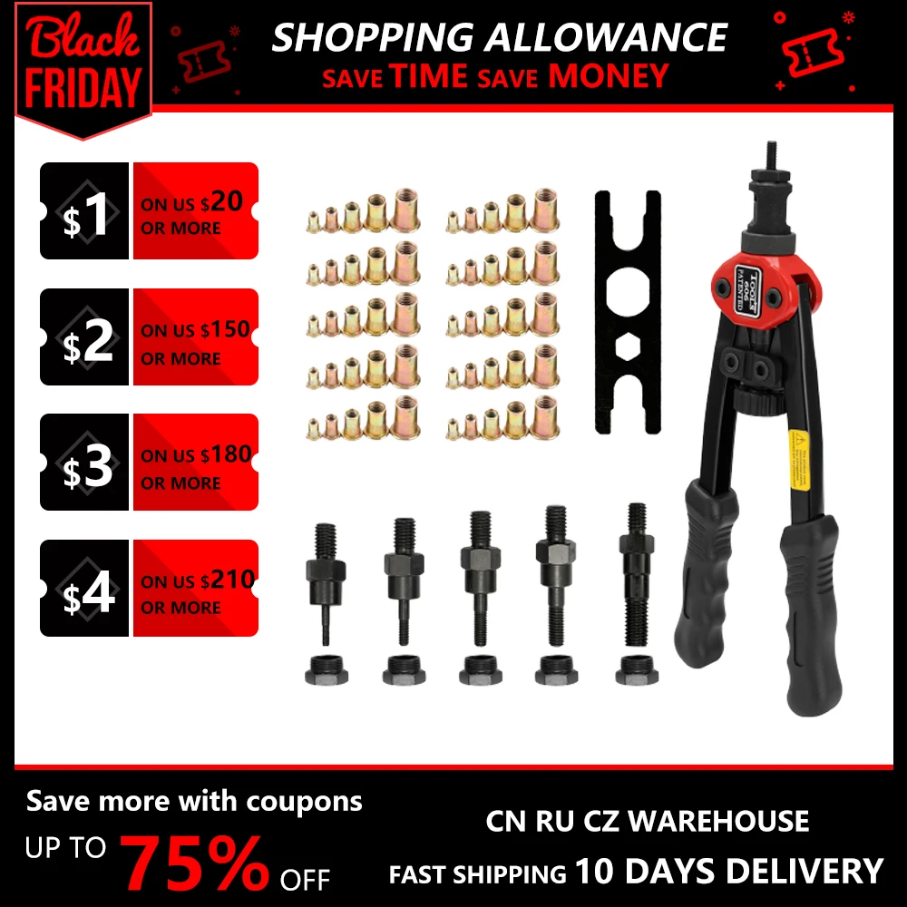 Заклепочник для гаек ручной BT 606, с 50 гайками, 5 головками M3, M4, M5, M6, M8