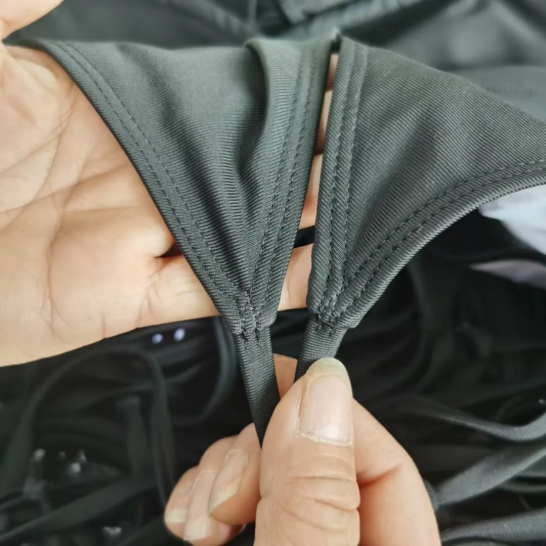 Ткань тонкая и шершавая, но смотрится неплохо. Завязки очень тонкие и пришиты не аккуратно. Мне он нужен был, чтобы в нём загорать, для этой цели всё подходит идеально. Минимально прикрывает. Купаться в нём не стоит, его смоет.