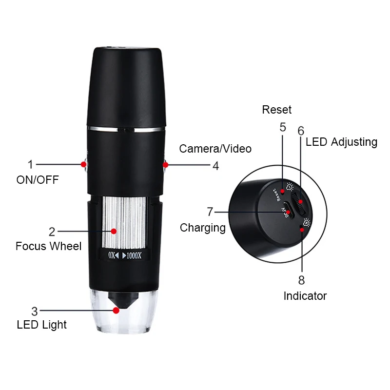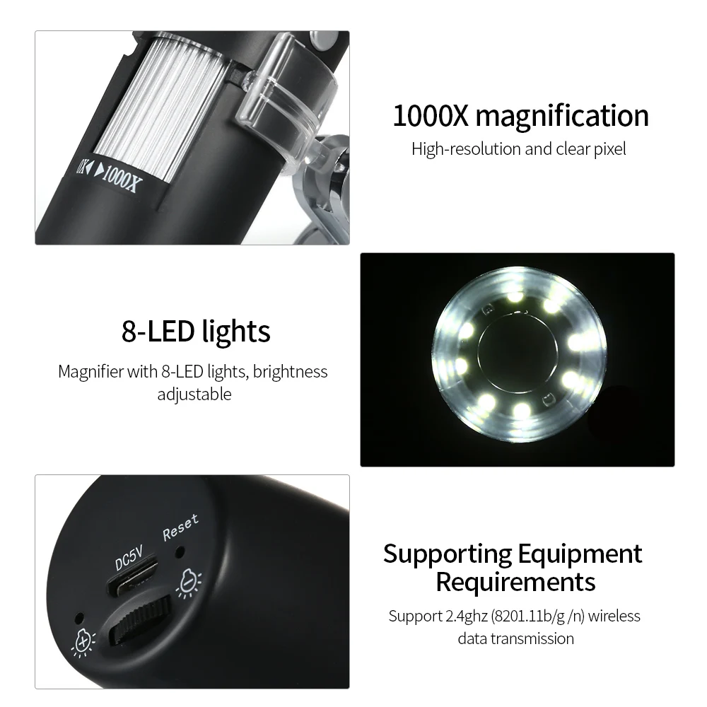 Цифровой микроскоп, 1000X увеличительное стекло с Wi-Fi, USB, 8 све...