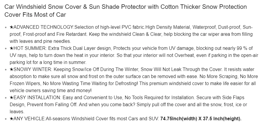 Любое транспортное средство: всесезонный чехол на лобовое стекло подходит для большинства автомобилей и внедорожников. 74,75 дюйма (ширина) X 37,5 дюйма (высота).