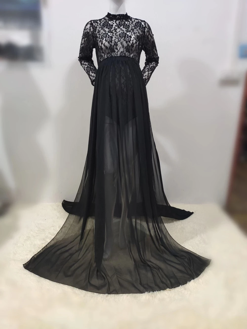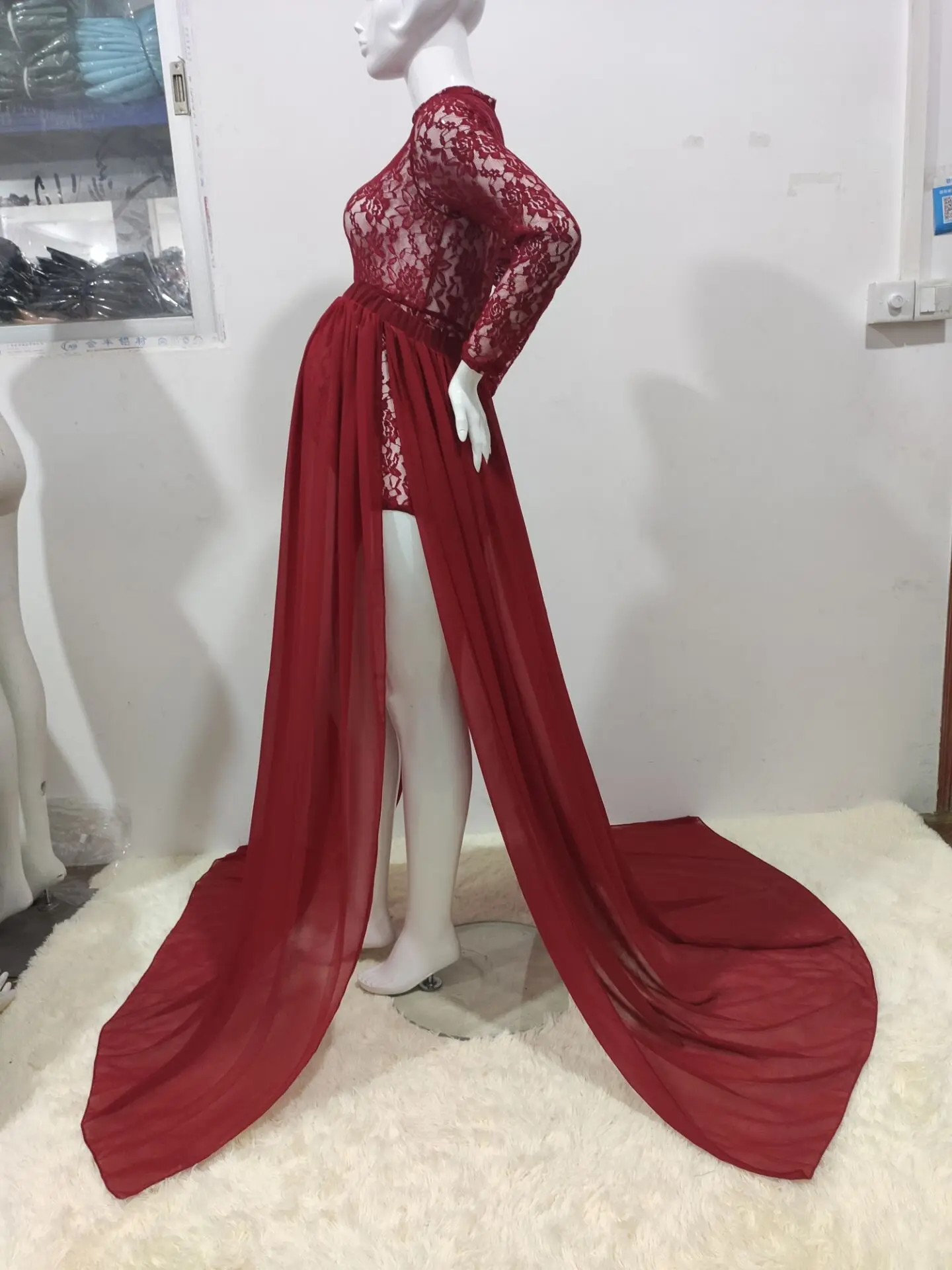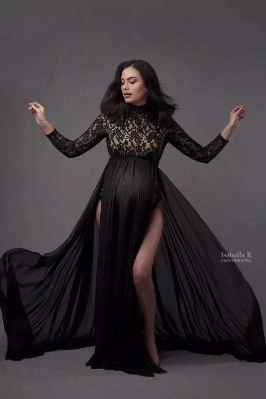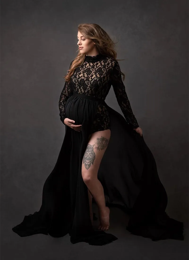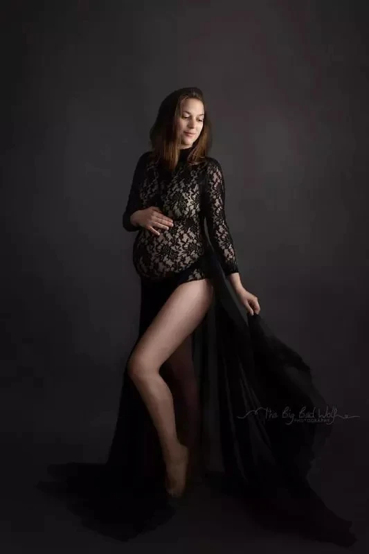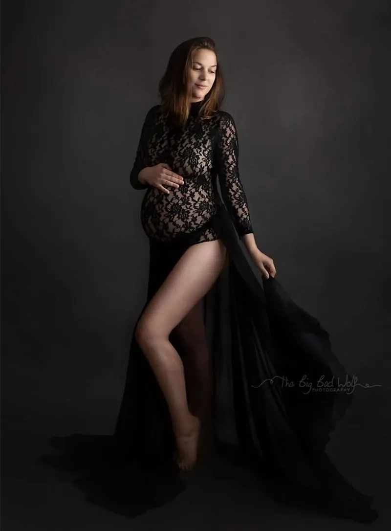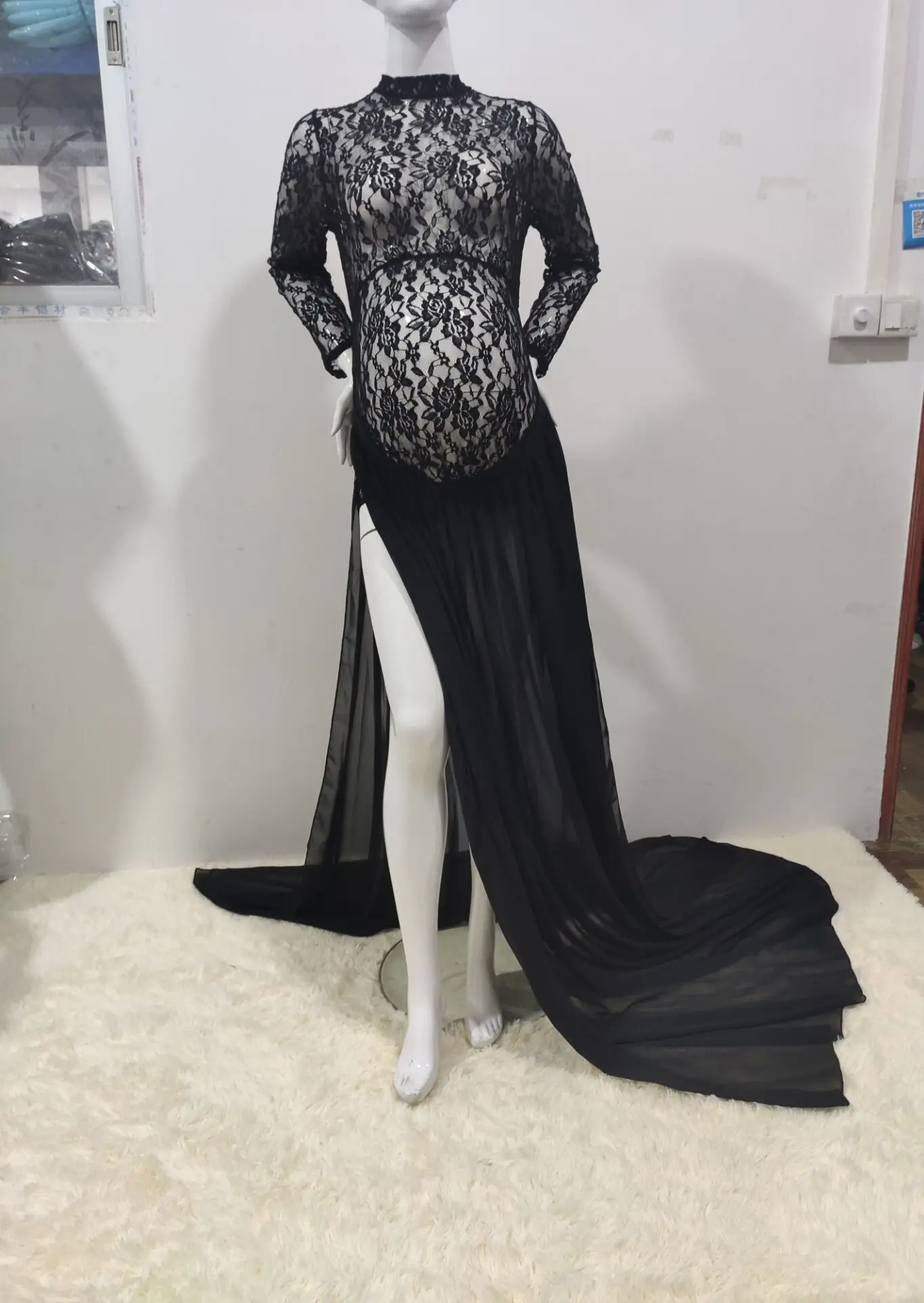 Длинное кружевное платье для беременных, с разрезом сбоку, фотография беременной женщины