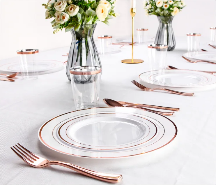 Подходит для любого случая:Благодаря изысканному и высококачественному дизайну наших одноразовых столовых приборов, их легко отбросить позже, эти пластиковые тарелки розового и золотого цветов идеально подходят для использования в качестве одноразовых свадебных тарелок или обедов, юбилеи и другие мероприятия.