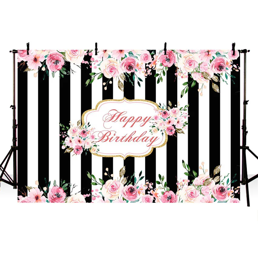 Mehofond день рождения фон для фотографии черный, белый цвет в розовую полоску; С цветочным рисунком вечерние декор для взрослых и детей, фон для фотосъемки с изображением фотозонт
