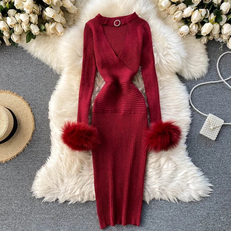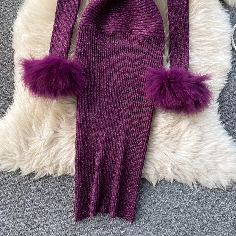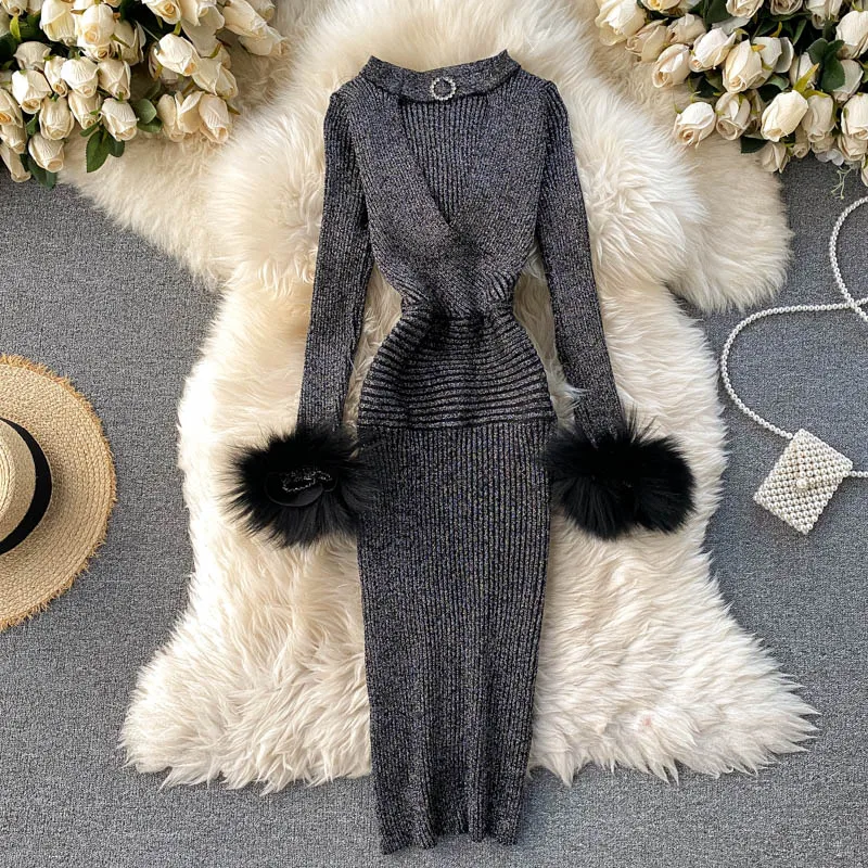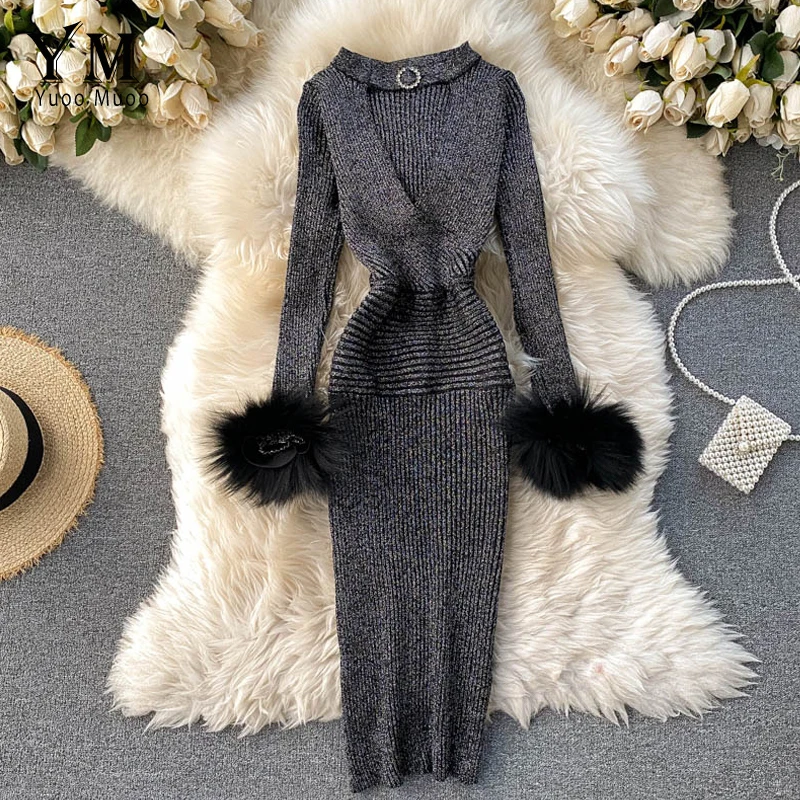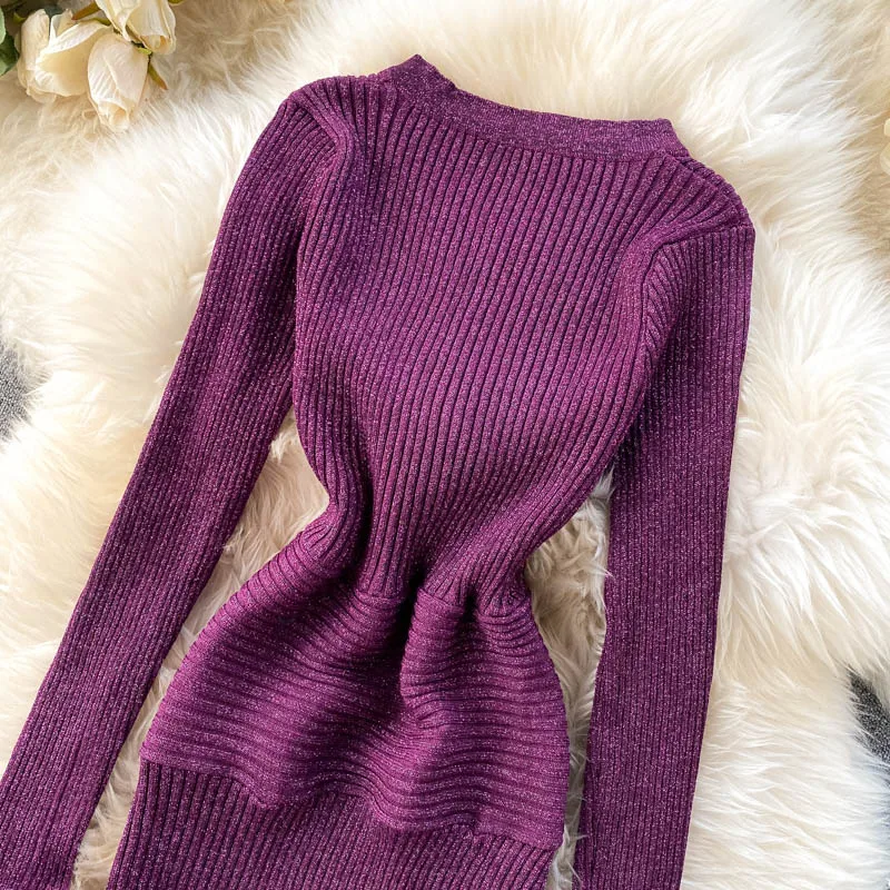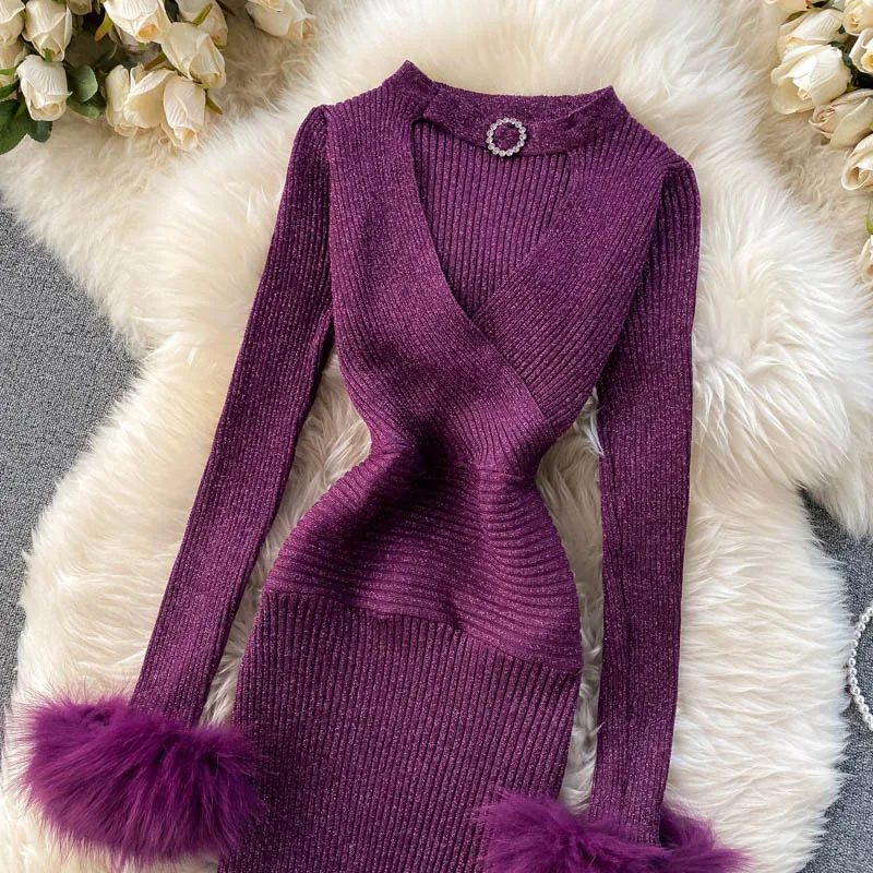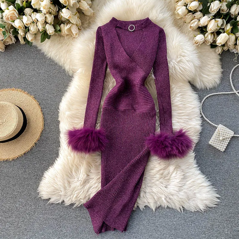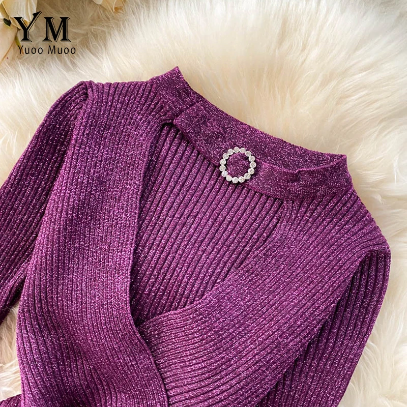 YuooMuoo, хорошее качество, роскошное блестящее трикотажное женское платье, сексуальное облегающее вечернее платье с V-образным вырезом, модное фиолетовое платье