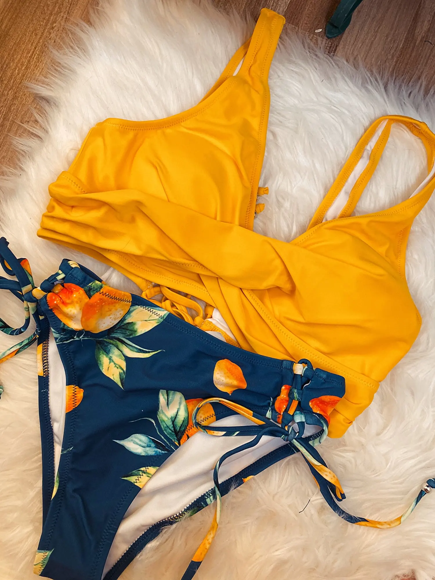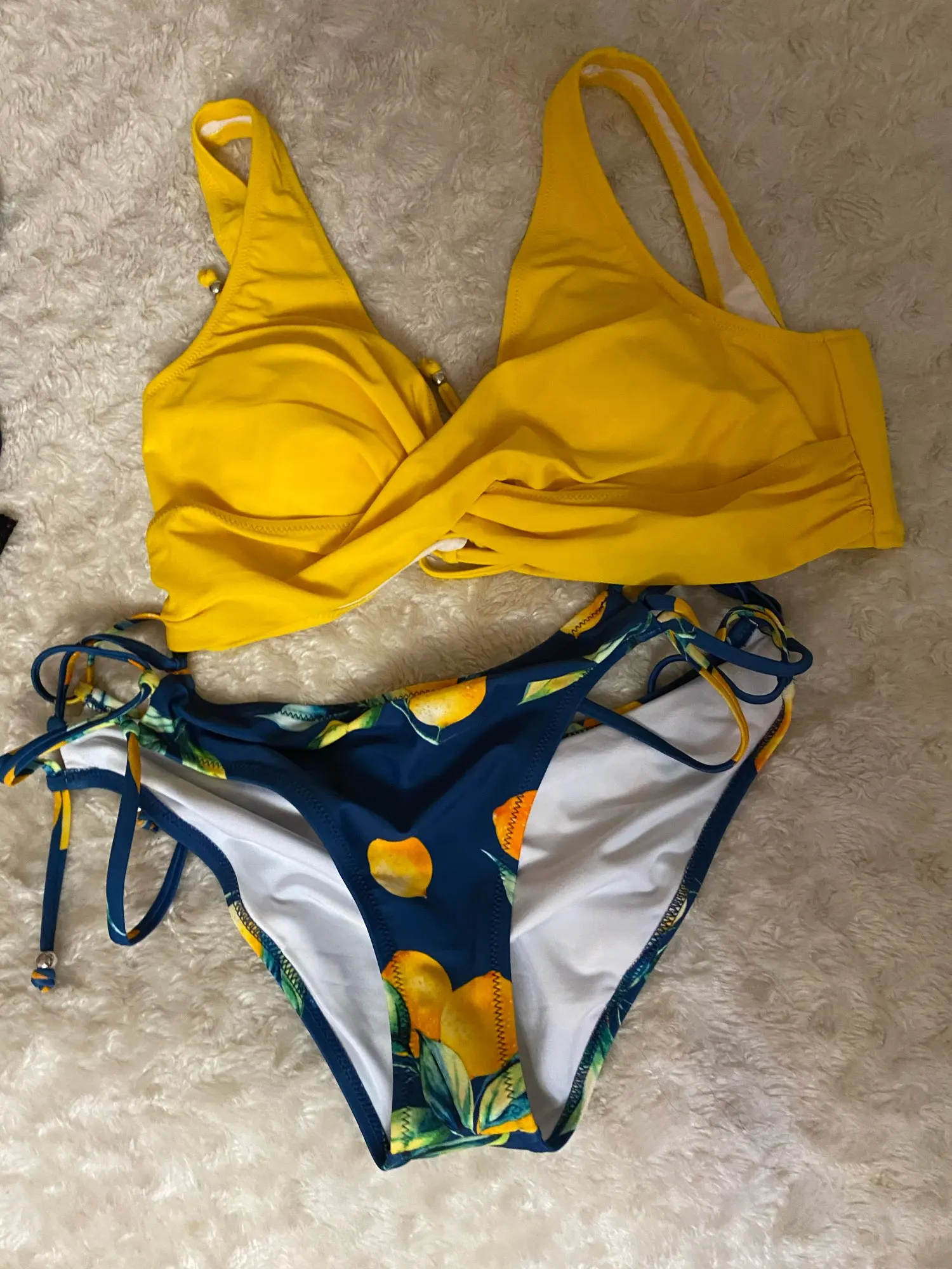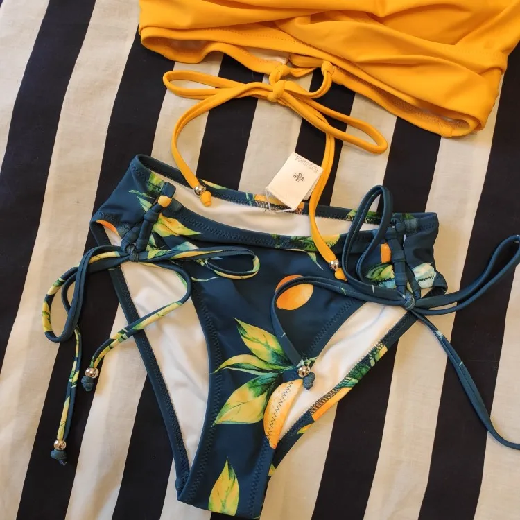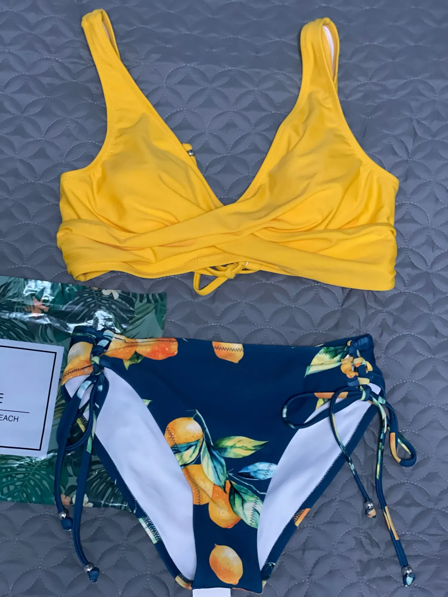 CUPSHEкомплект бикини с желтым и лимонным принтом, со средней талией, купальник для женщин, сексуальный, на шнуровке, два предмета, купальник, новинка 2022, пляжные купальные костюмы