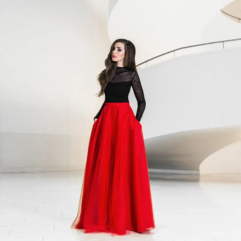 Женская длинная юбка с карманами, элегантная красная фатиновая юбка-пачка с высокой талией, вечерняя драпированная юбка для выпускного вечера