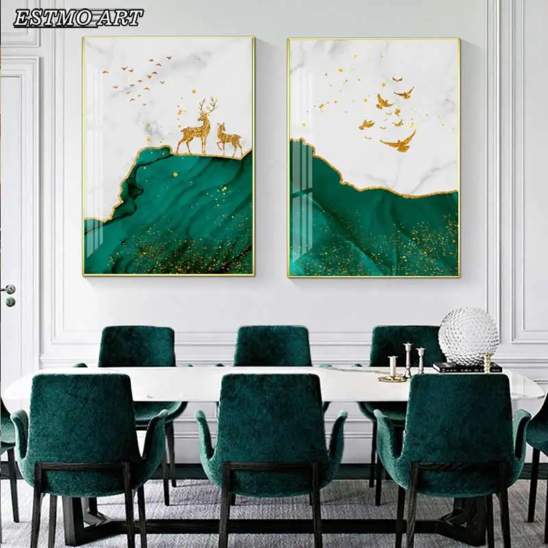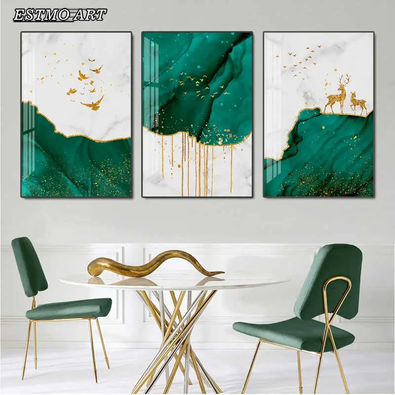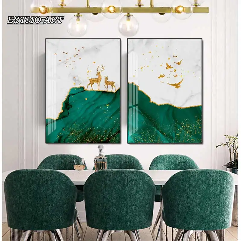 Холщовая живопись, Абстрактные Художественные Плакаты HD, Золотой и зеленый лось, птица, картина, художественный декор, настенные декоративные картины для гостиной Живопись современного северного минимализма