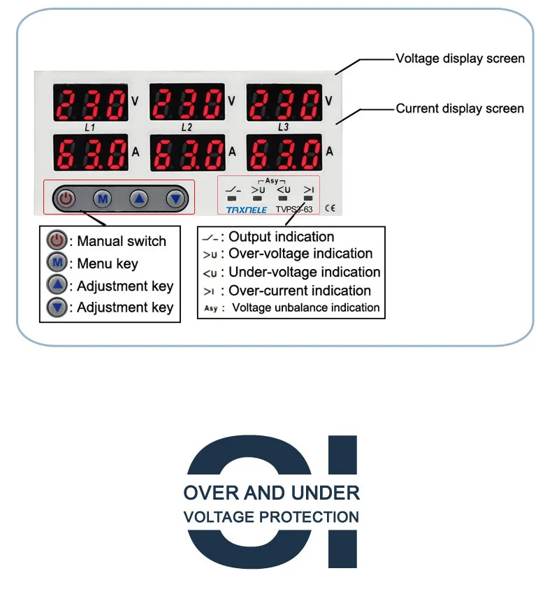 1. Защита от перенапряжения 2. Регулируемая Защита от пониженного напряжения 3. Регулируемая Защита от перегрузки по току 4. Асимметричная защита 5. Фазовая защита 6. Автоматическое восстановление с регулируемым временем