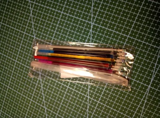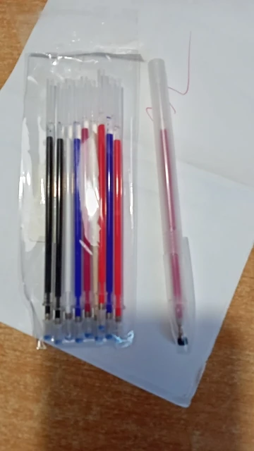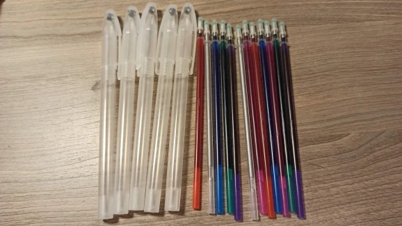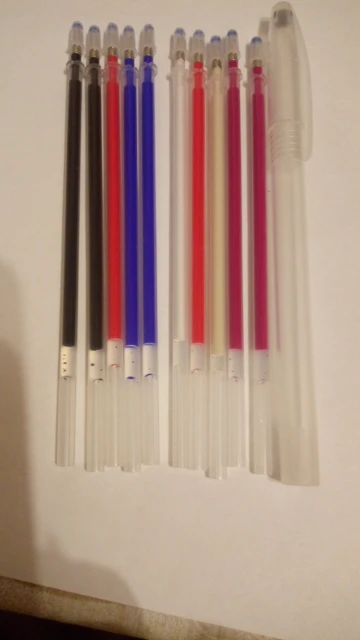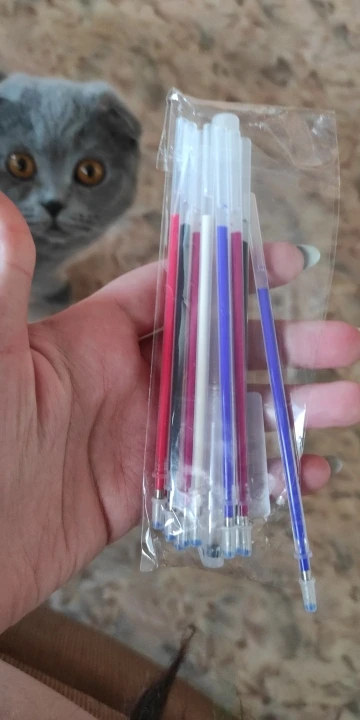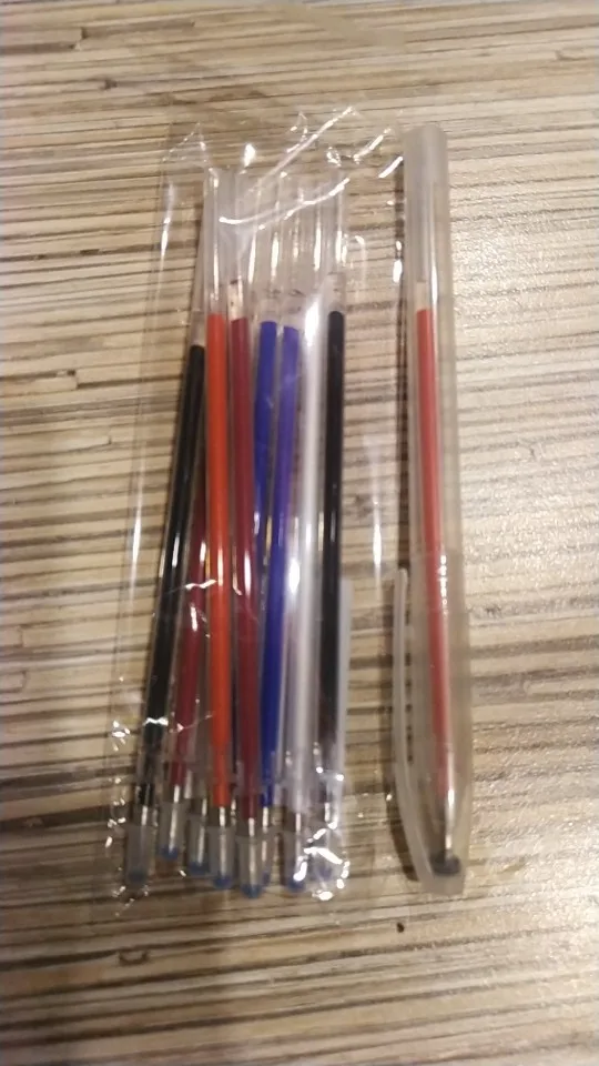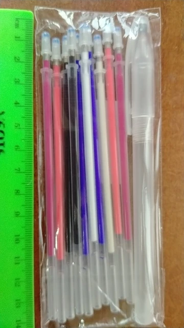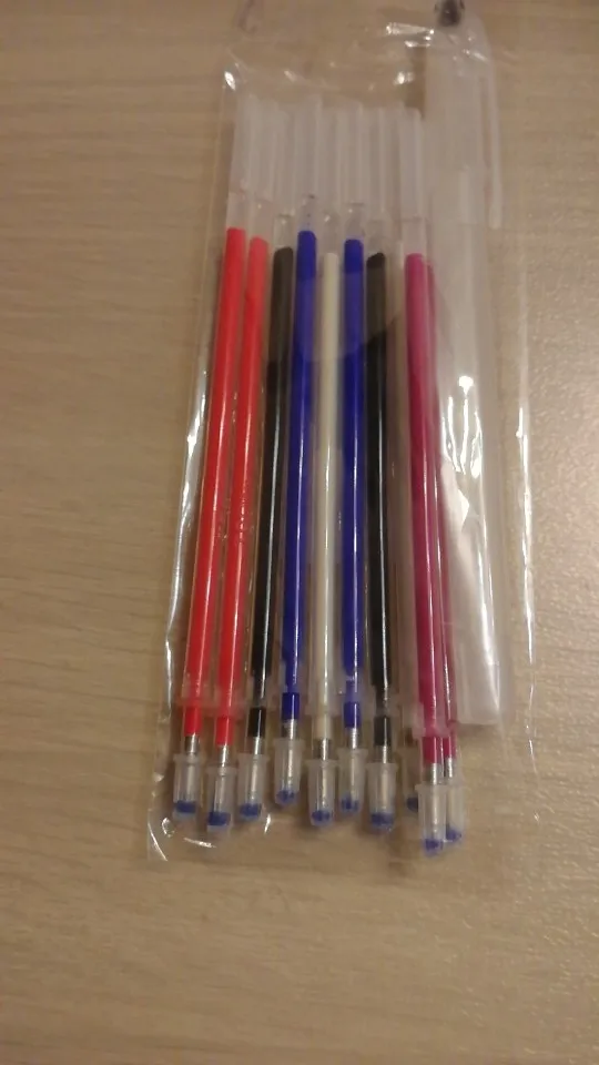 хорошие стержни, не вытекшие , доставка месяц. попробовала на разных тканях, хлопок, двунитка и трикотаж, с хб исчезли от одного прикосновения утюгом, но не до конца, на трикотажа хуже, но после воды вроде исчезли. в целом классные, с ручкой вообще удобно