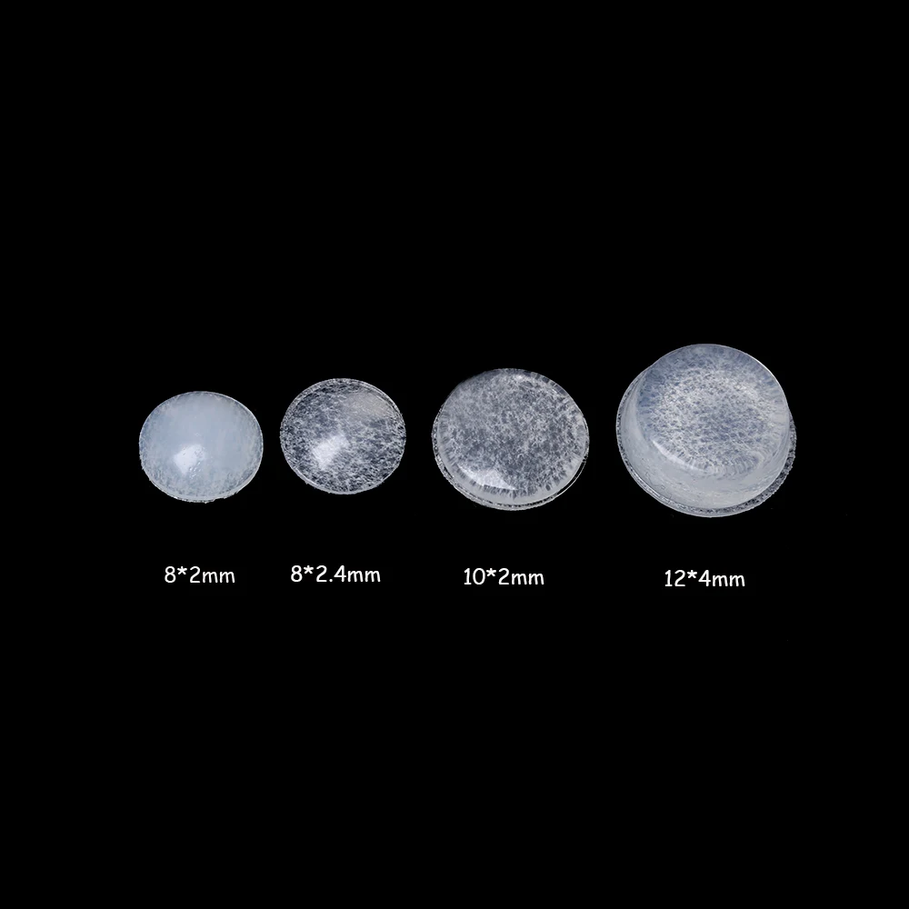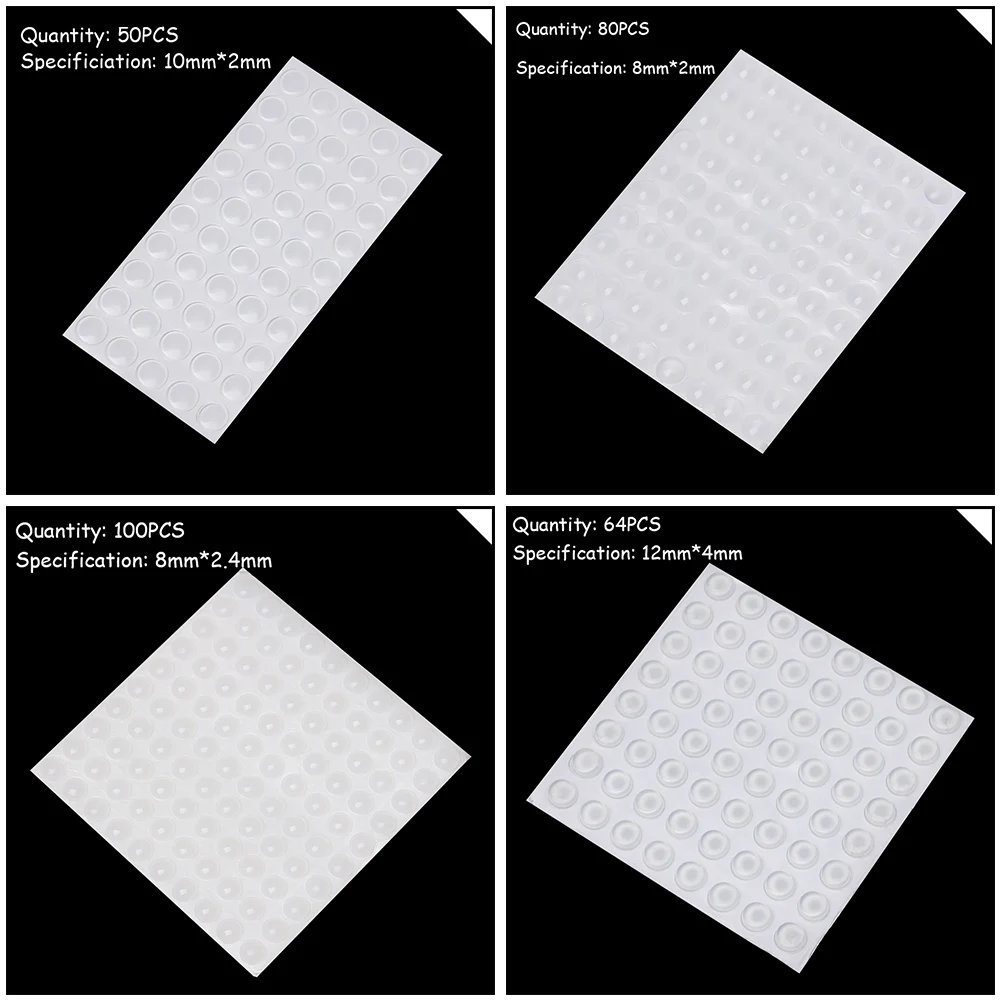 Материал: силикон Количество: 50/64/80/100 шт Спецификация (диаметр * высота): 8*2 мм; 8*2,4 мм; 10*2 мм; 12*4 мм Цвет: прозрачный Подходит для: двери, ящика, унитаза, шкафчика, шкафа, компьютера, телефона и так далее