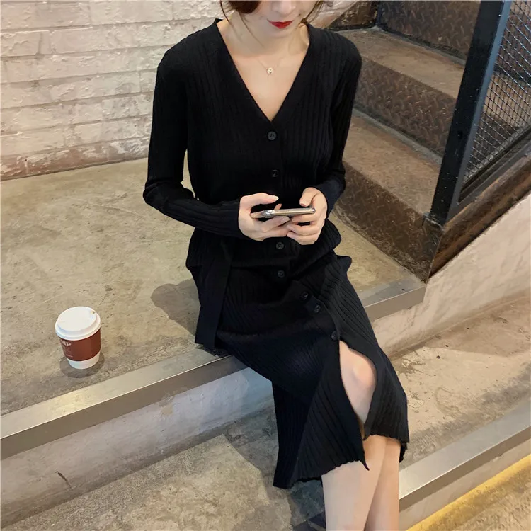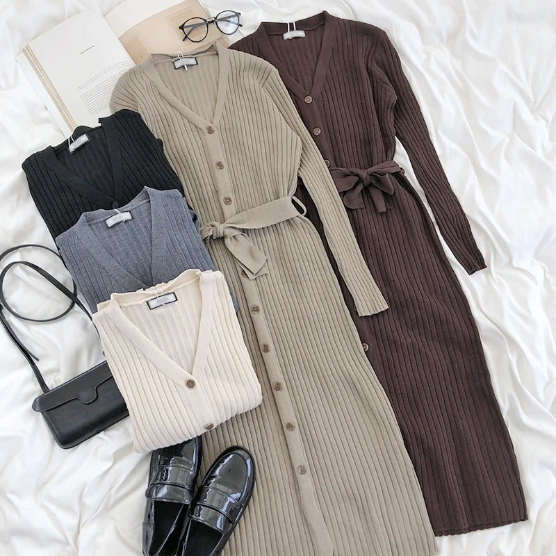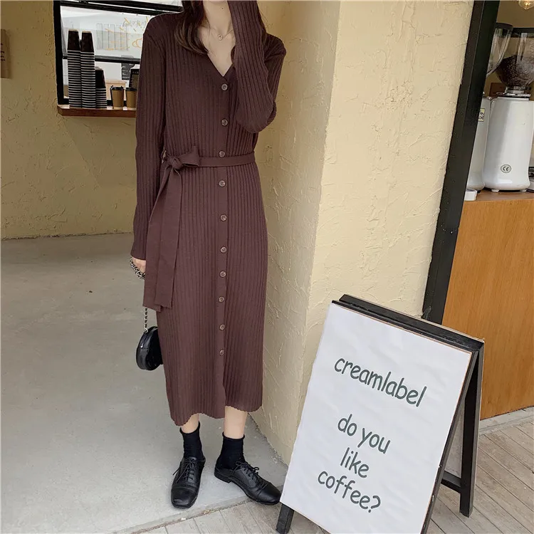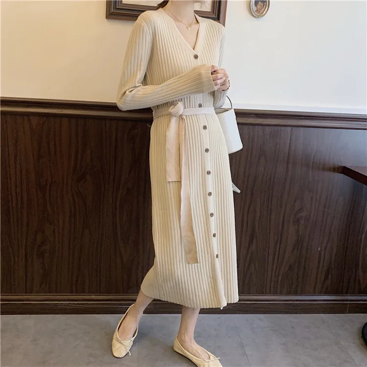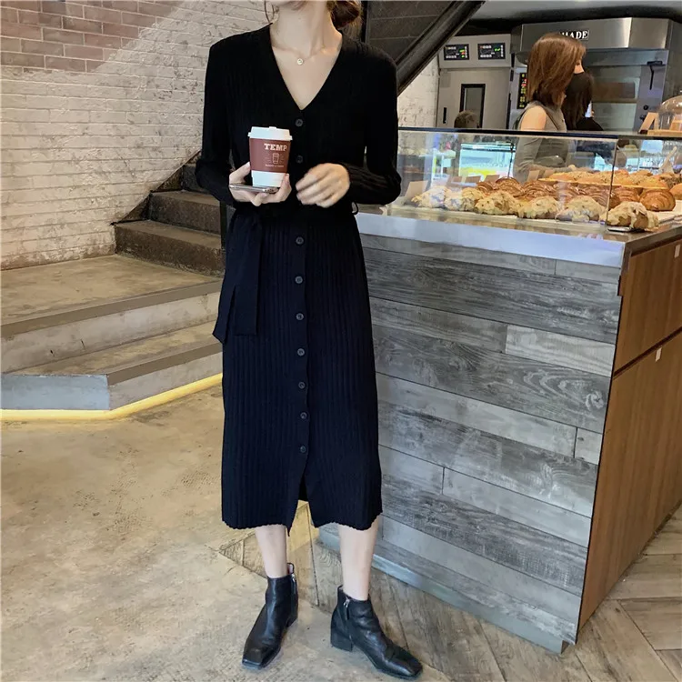 Женское трикотажное платье-свитер, повседневное однобортное платье миди с длинным рукавом и V-образным вырезом, весна-осень, 2020