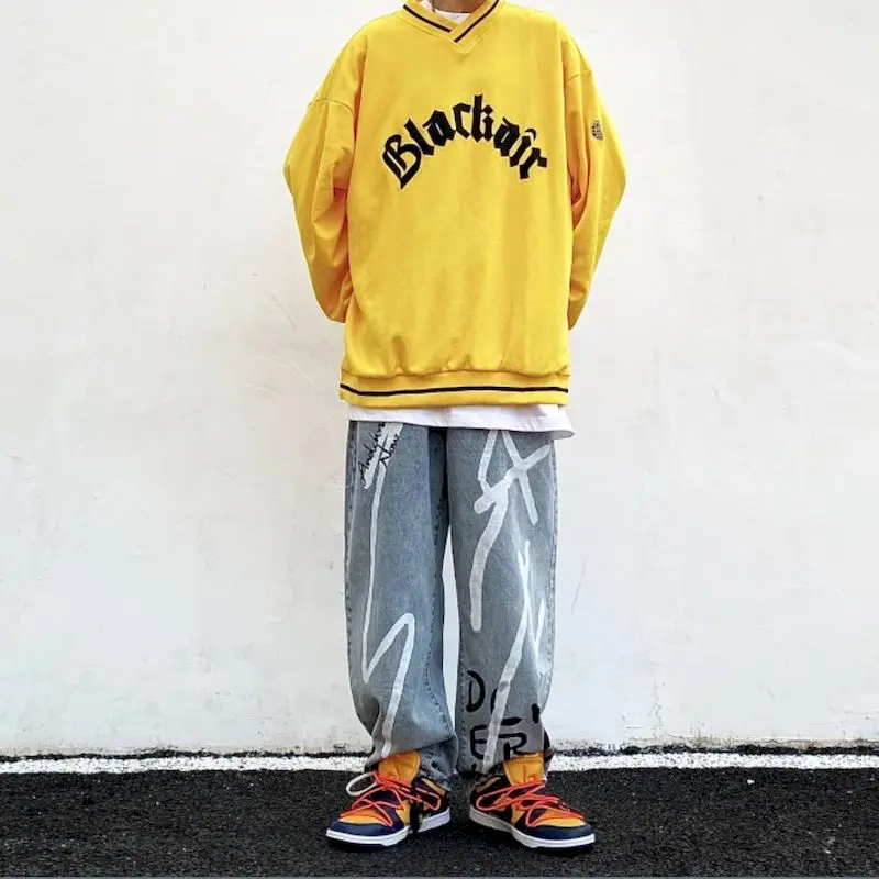 Мужские джинсы с принтом, винтажные прямые широкие брюки в стиле хи...