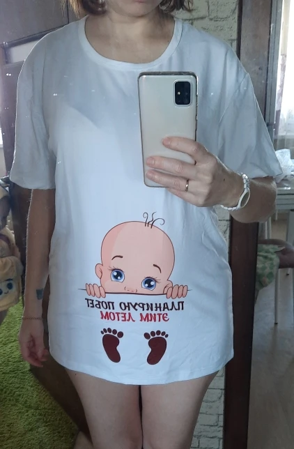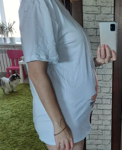 в целом неплохо. но она огромная. по длине как туника вышла. по ширине тоже плечи висят. мой размер 44-46 заказывала L, учитывая отзывы, но пришел где то 50-52 размер. хотя на самой футболке размер никак не указан, может 52-ой и пришёл. торчат нитки на лицевой стороне. сейчас 20 недель, может ближе к 30 стану носить.