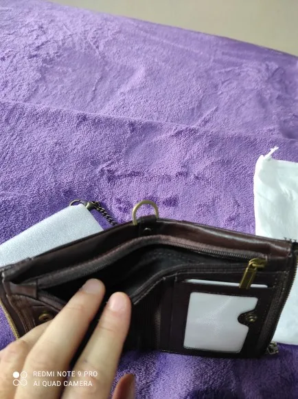 кошелек, понравился, но не восторг, сшит топорно, внутри не кожа, а синтетический материал, кармашков не очень много, две карты, максимум. В отделение без замка деньги входят без труда, а вот в отделении под замком будет проблематично деньги доставать, велика вероятность их порвать....В принципе, за эти деньги норм. похоже на кожу,