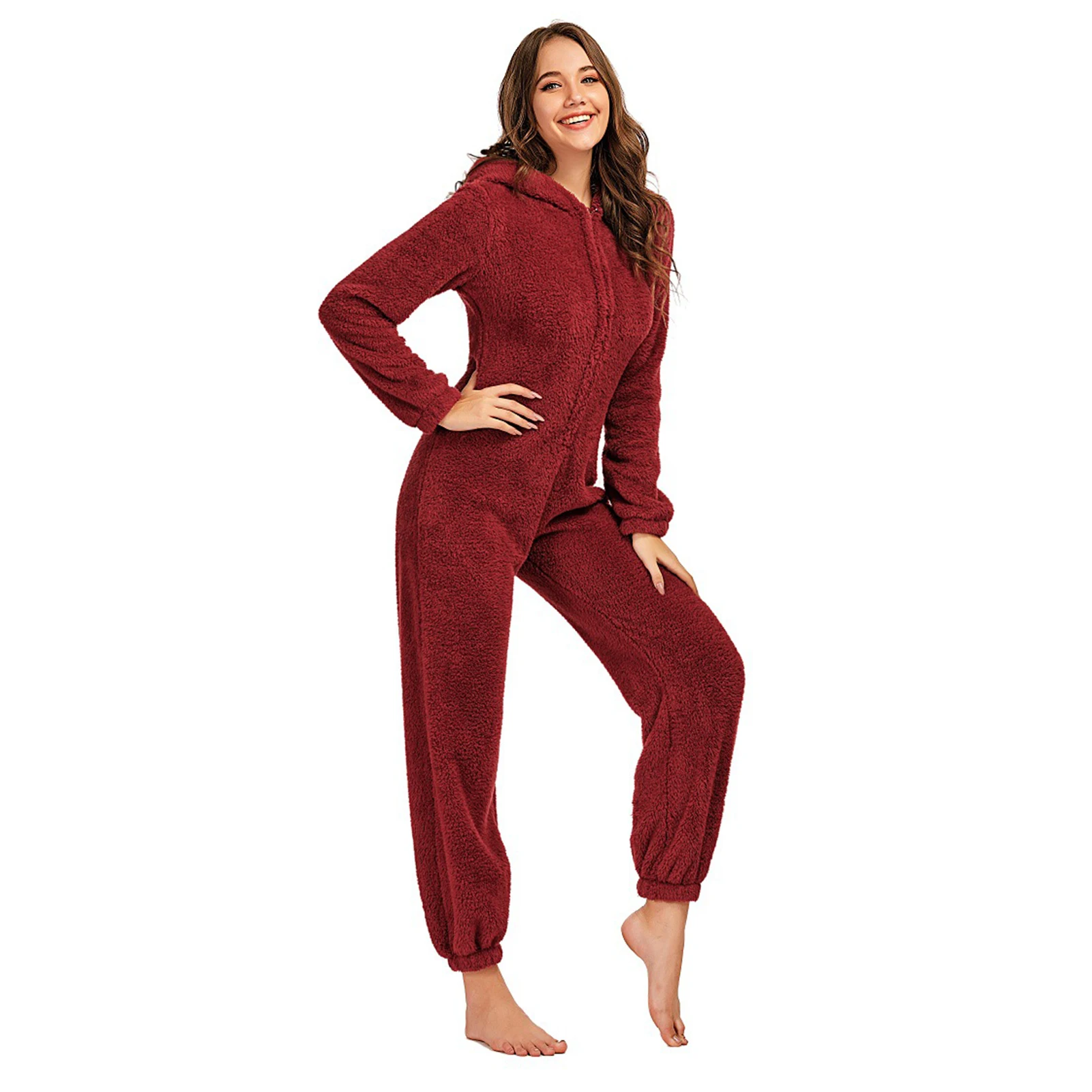 Женские Зимние флисовые плюшевые комбинезон, пижамы с длинными рукавами, с капюшоном и застежкой-молнией Толстая теплая домашний комбинезон