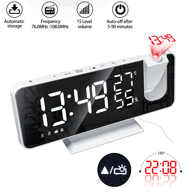 Проекционный электронный будильник, зеркальный светодиодный цифровой будильник с отображением температуры и влажности, USB прикроватные часы с радио