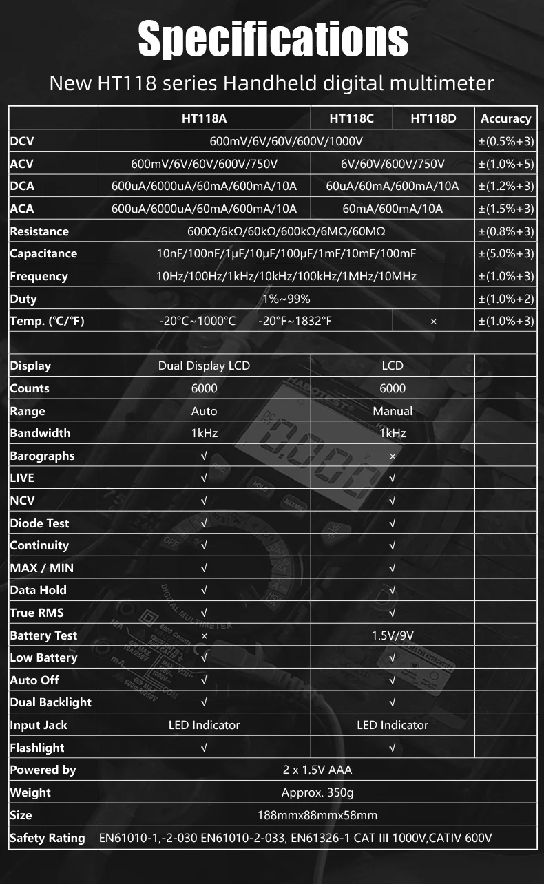 HT118 Автоматический цифровой мультиметрвольтметр в режиме реального времени точный Батарея Напряжение тестер с бесконтактная проверка напряжения переменного Функция