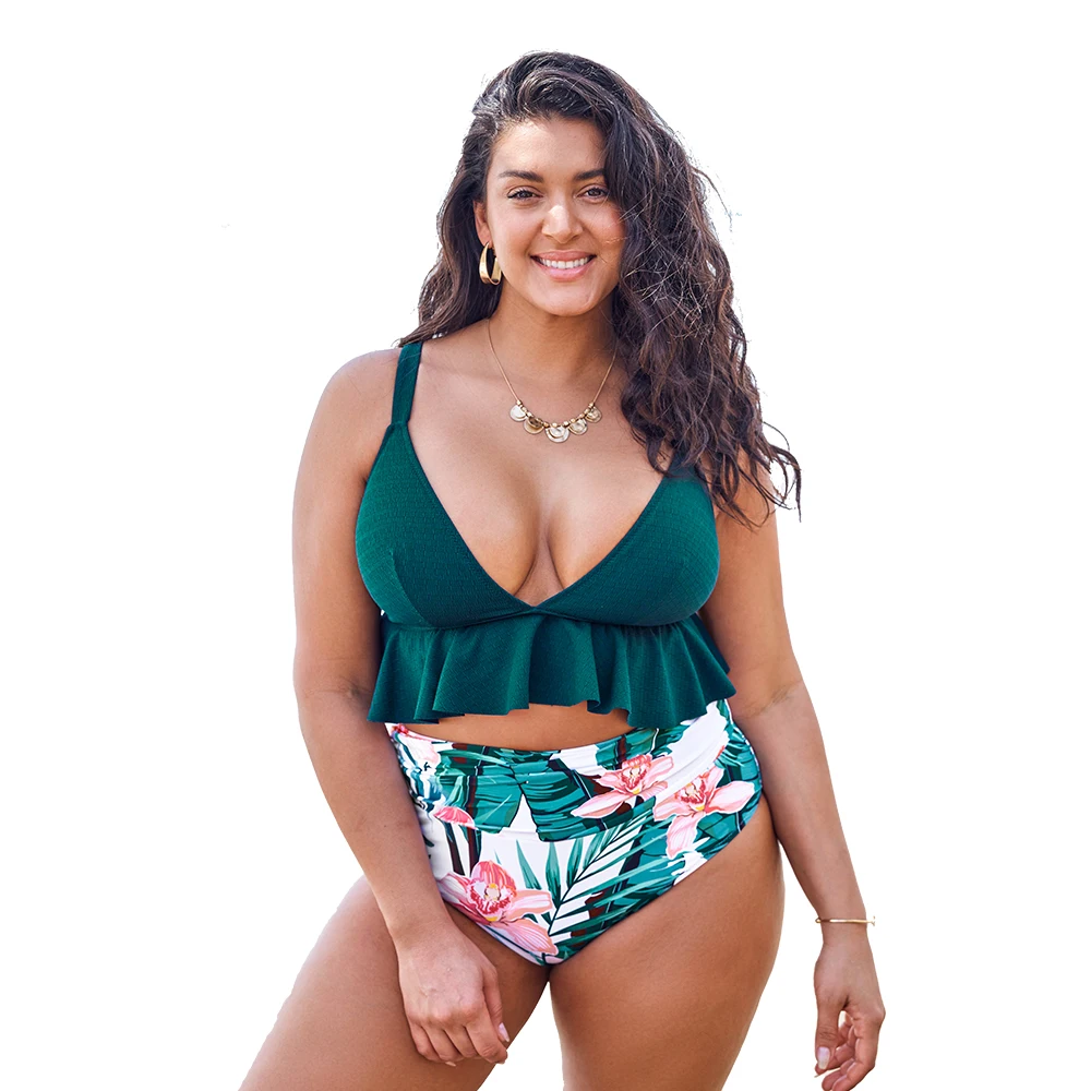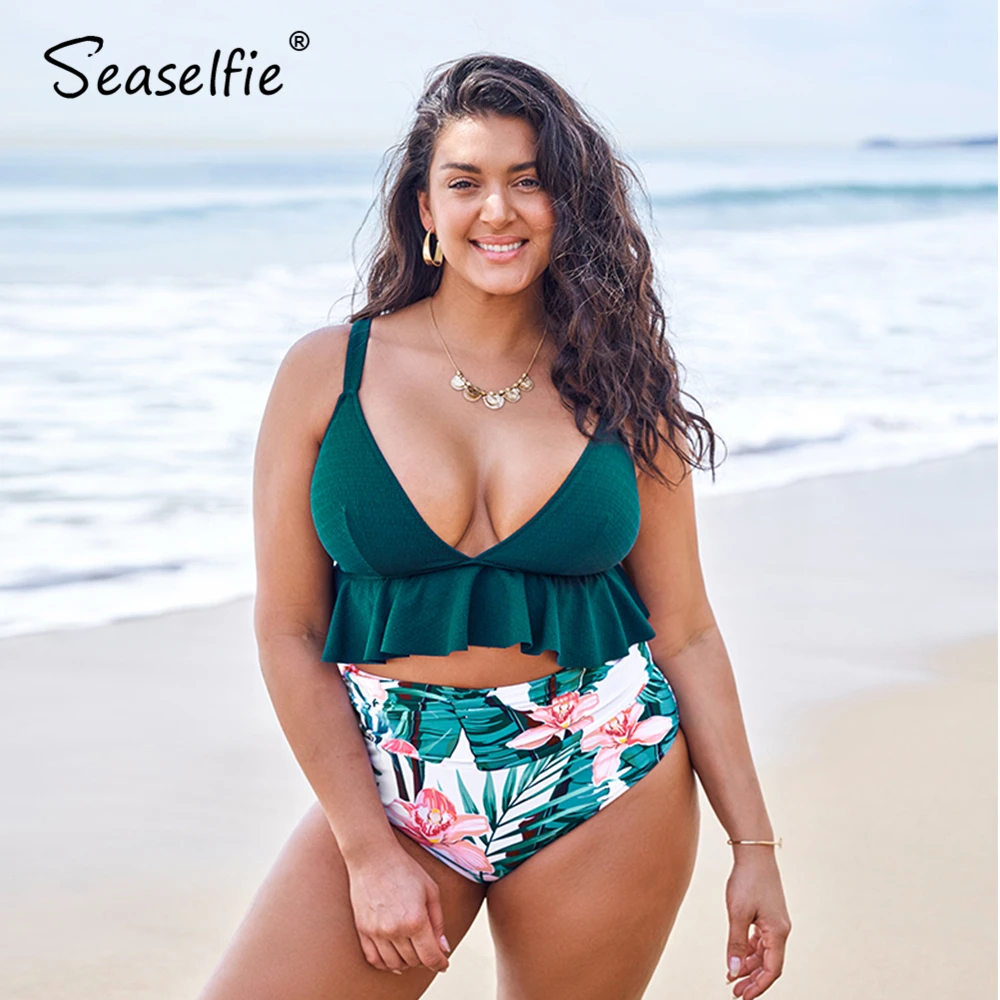 SEASELFIE размера плюс женский купальник бикини с высокой талией большого размера с зелеными и цветочными оборками, купальник из двух предметов 2022, купальный костюм