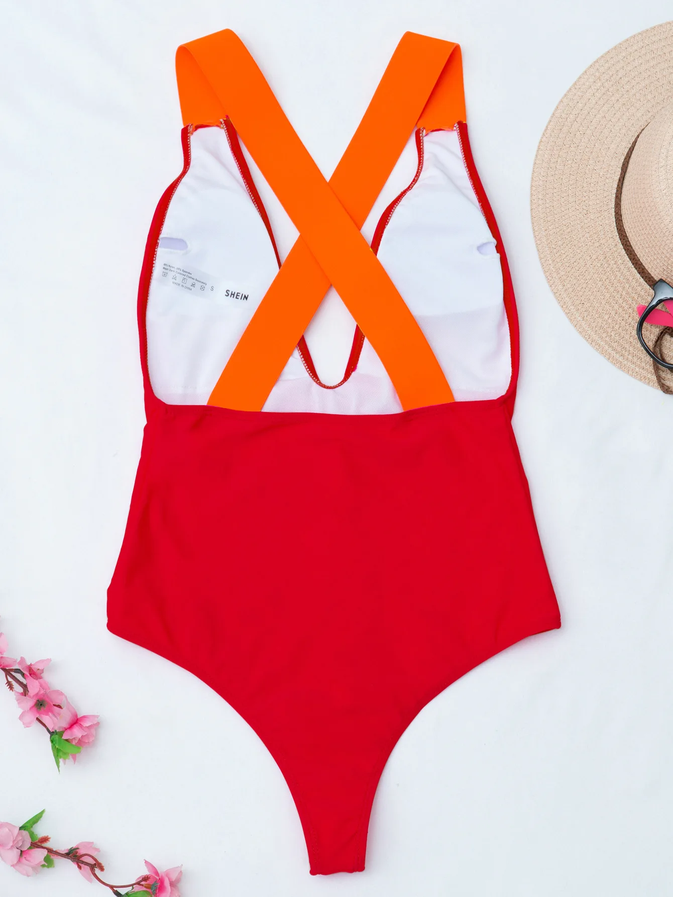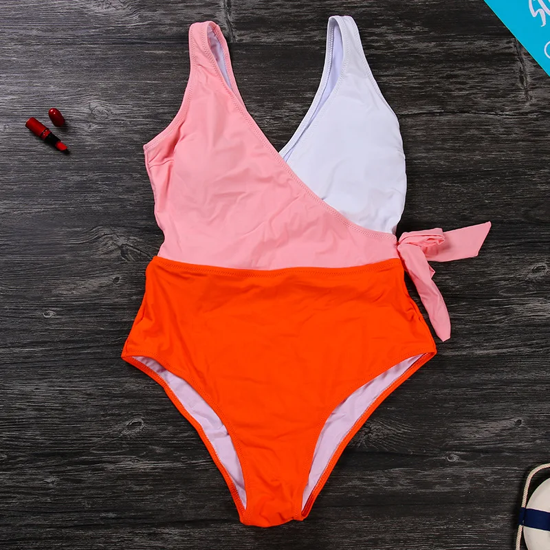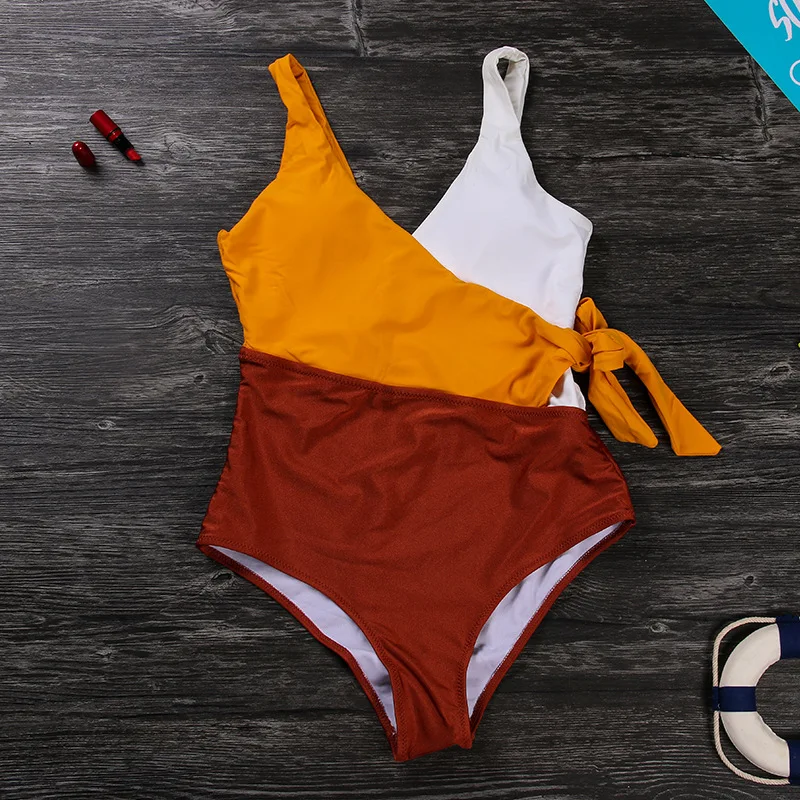 Женский цельный купальник, купальный костюм с узлами, цветные блоки...