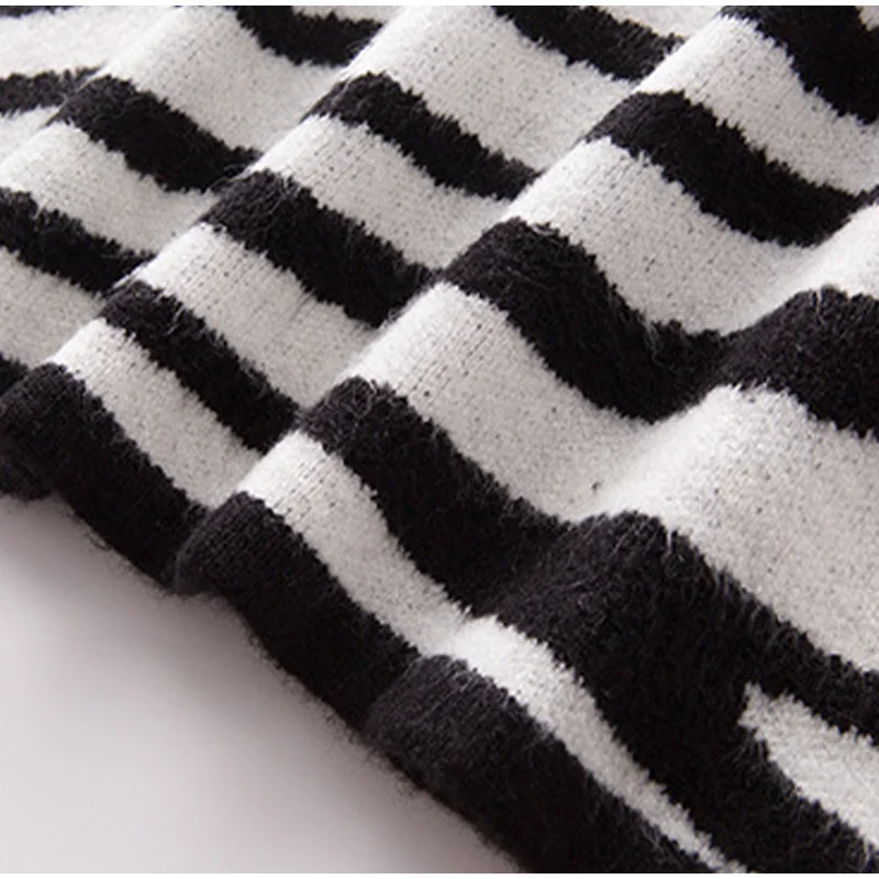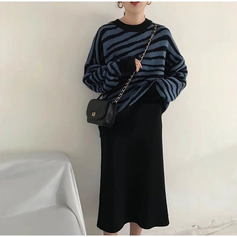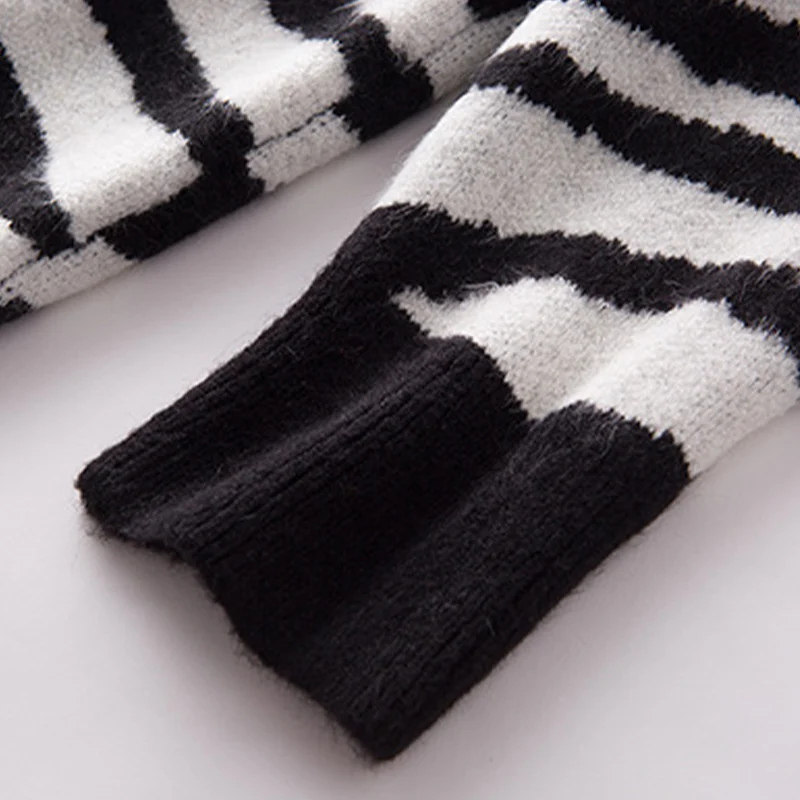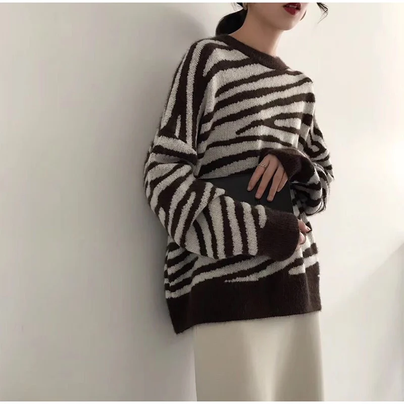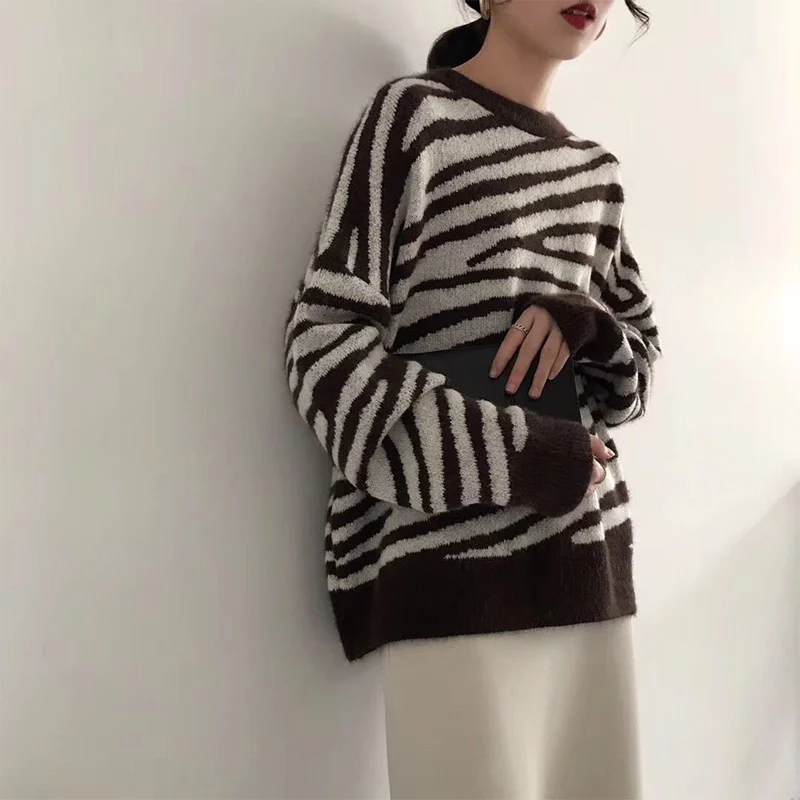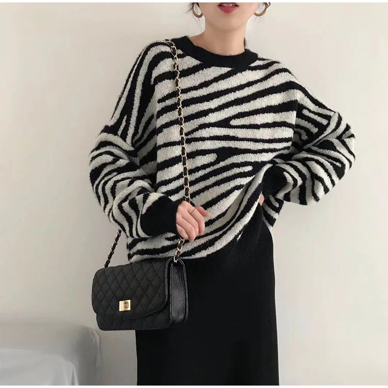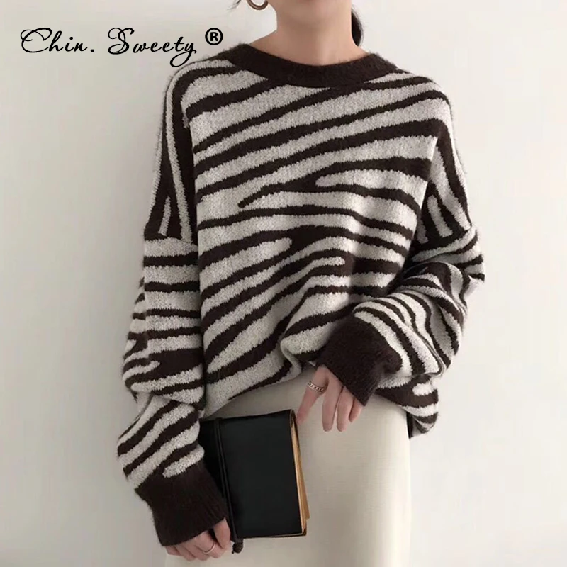 Полосатый вязаный женский пуловер с принтом зебры, Свитера 2020, осенне-зимние шерстяные свободные женские повседневные Пуловеры с рукавами летучая мышь