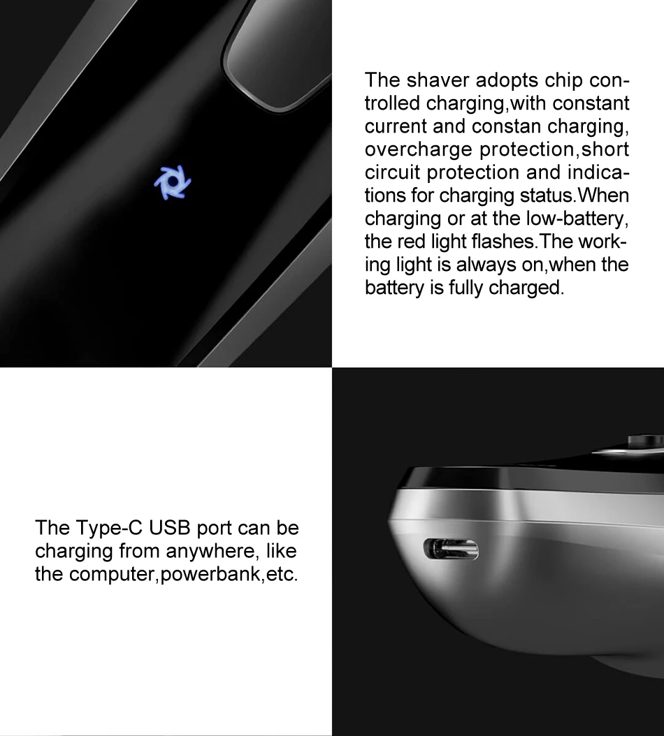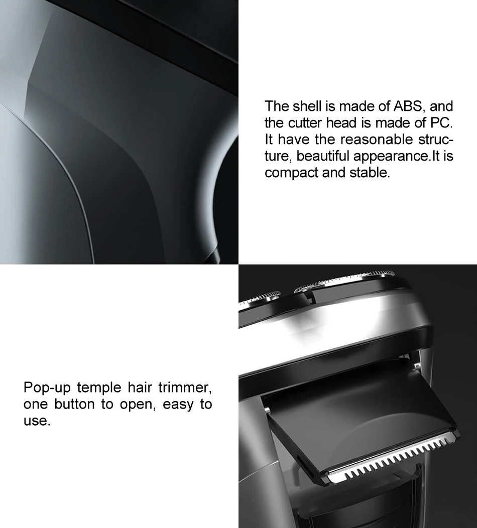 1. 3D Независимая плавающая режущая головка Эта Бритва имеет три комплекта самостоятельно плавающие резак головки, которые добавляют 1/3 бритья зоны меньше энергии, чем обычная двойной резец бритвы. Режущая головка имеет гладкую ощупь и эластичные шпон для того чтобы приспособиться к различным контуры лица. 2. Ультра-тонкий двойной резец кольца Нож чистый лезвия от двух катушек, дизайн, что значительно увеличивает нож и уход за кожей лица площадь контакта, и эффективность бритья увеличивается в два раза. 3. ESM умное бритье Системы 5 Вт высокой мощности, мощный блок, низким уровнем шума управления обеспечивают комфорт при носке. 4. Интеллигентая (ый) травмозащитная При низком заряде батареи, бритве может держать резак постоянная скорость и избежать низкоскоростной зажим. 5. Зарядка в течение 1 часа, используя 2 месяца Идеально подходит для путешествий 6. Разделение дизайн Режущая головка в сборе и фюзеляжа отдельно предназначены. При чистке, режущая головка крышка может быть вытащить и положить в воду для полоскания. После того, как мыть и сушить, операция проста и удобно. 7. Автоматический шлифовальный станок лезвие В состав материала данной режущая головка чистая сделана из импортированной нержавеющей стали из Японии. Именно по фигуре. В тех случаях, когда бритва открыт, лезвие автоматически землей для того чтобы держать режущая головка sharp и прочный.