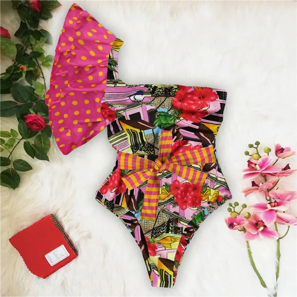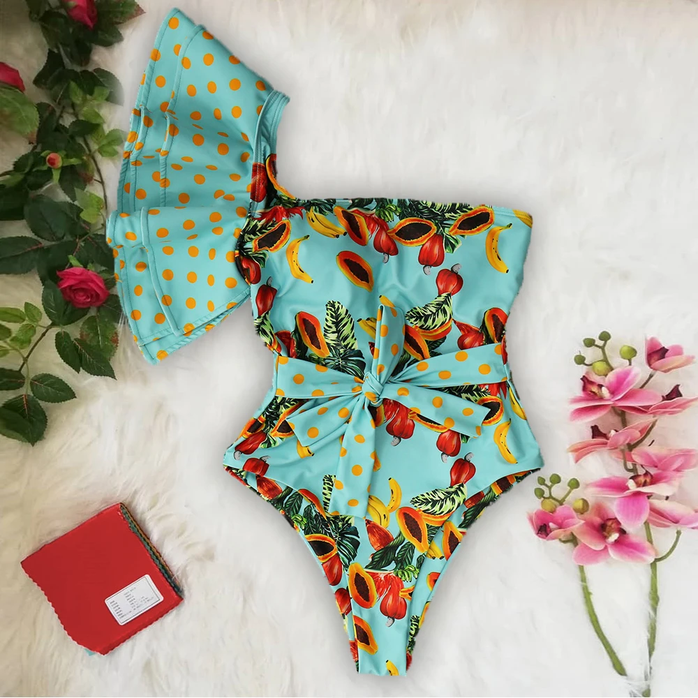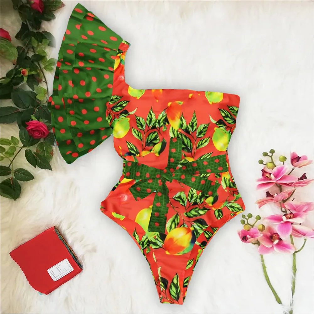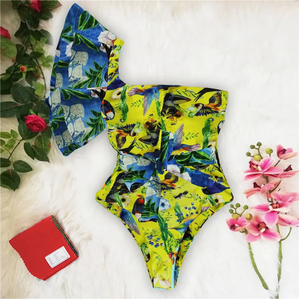 2021 Ретро цельный купальник женский купальник пуш-ап Монокини с принтом бандажный купальный костюм на одно плечо боди Женская пляжная одежда