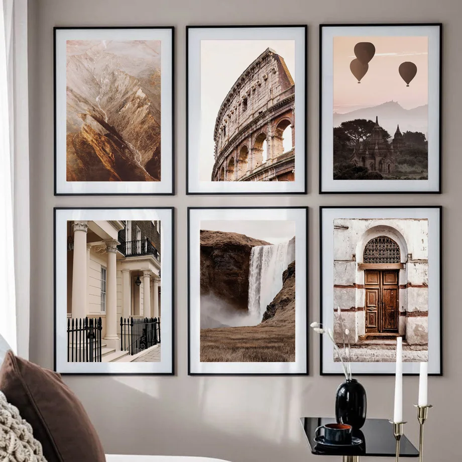 Горный Колизей деревенская дверь водопад огненный воздушный шар скандинавский плакат настенный художественный Принт Холст Картина Декор картина для гостиной
