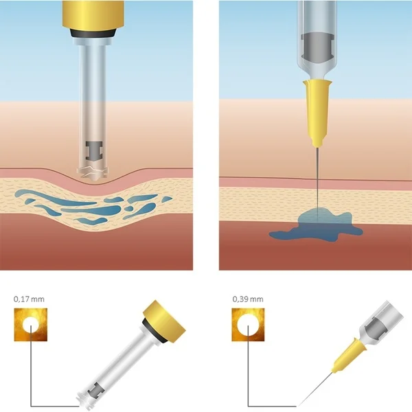 Под давлением, пружина и поршень может быстро и равномерно инъекционные наркотики под кожу через отверстие диаметром 0,1 мм, диаметр которого в два раза меньше толщины иглы для инъекций!С помощью механической энергии пружины и специальные поршни в устройстве позволяют быстро, но медленно протолкать лекарство через крошечные отверстия подкожной клетчатки под давлением.По сравнению с введением игл, поглощение и поглощение лекарственных средств намного лучше и быстрее. Это было подтверждено в серии исследований и тестов, проводящихся в разных странах по всему миру.Идеальное решение для людей, склонных к рубцам и сгусткам крови под кожей.