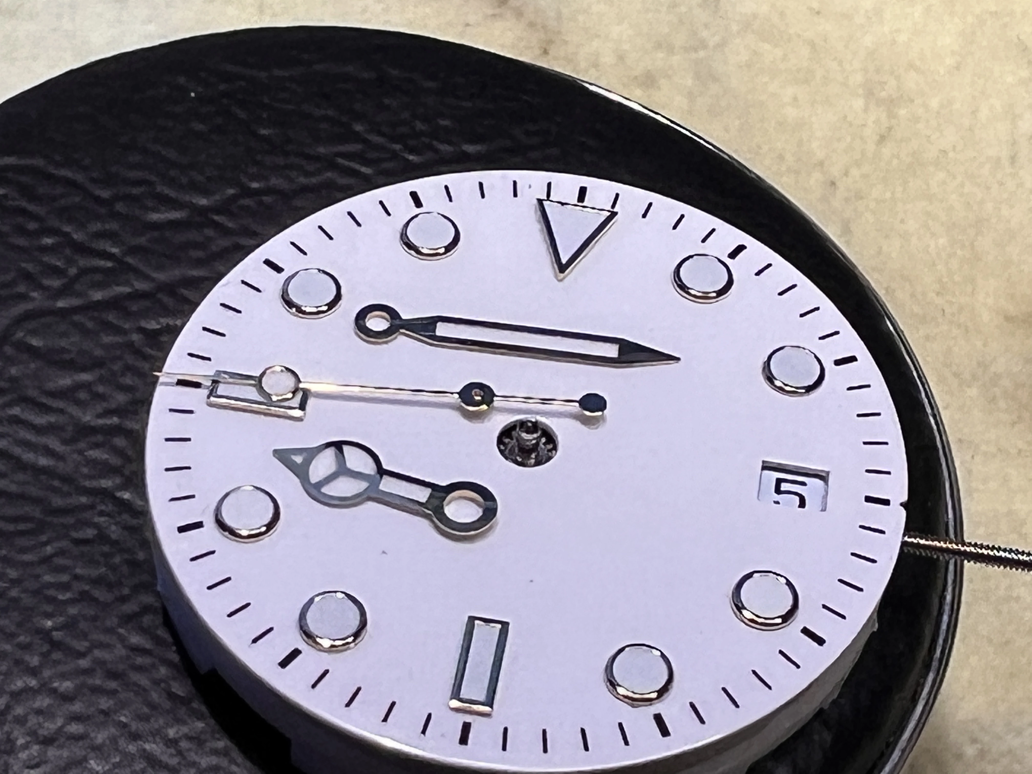 Я заказал циферблат и стрелки специально для PT5000/eta2824, а часовой диаметр руки слишком велик около 1,84 мм, в то время как часовая спица около 1 мм. Минимальная рука-это правильный размер, а вторая-слишком маленькая, чтобы подходить для peg. Эти руки не будут работать с этим движением, несмотря на заказ специально для этого движения.