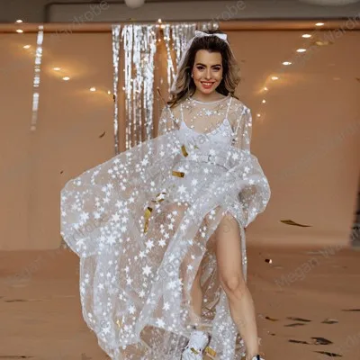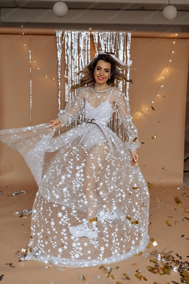 Очаровательные блестящие длинные прозрачные тюлевые платья со звездами и аппликацией для девочек-подростков, летнее Повседневное платье с высоким разрезом и рукавами, 2020
