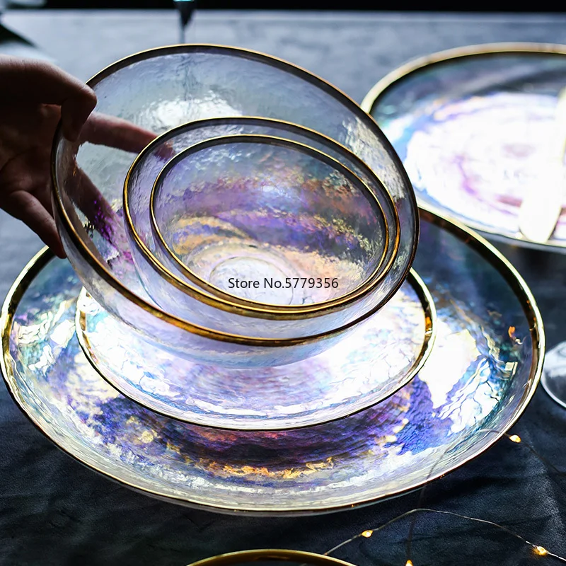 Чаша из блестящего стекла золотого цвета, семь цветов, прозрачная стеклянная тарелка с молотком, Салатница, фруктовая чаша, Западная еда