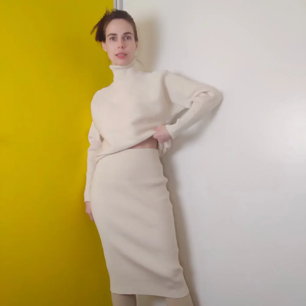 Замечательный смесовый трикотаж, дышащий и приятный. Вариант на весну и осень. Много обзоров на товары премиального качества в ин-ста @Lavanda_Loves Комплект состоит из свитера-водолазки и удлинённой юбки-карандаш длины макси. У комплекта в красивой технике связан ворот горловины и нижняя резинка, нежно смотрится. Пряжа эластичная, прочная, по объёму не тонкая и легкая, с упругой вязкой.Вязка классической лапшой и фактура ткани идёт в разных направлениях: диагональ, горизонтально и вертикально. Это создаёт определенную динамику и интересный вид всего комплекта. Комплект легко разбирается и носится частями - вместе и по отдельности. Сшито изделие аккуратно и все швы почти незаметны даже с изнанки. Пряжа хорошо держит форму, при этом эластичная и упругая. Трикотаж сидит плотно и красиво облегает фигуру, скрывает недостатки благодаря плотности ткани.