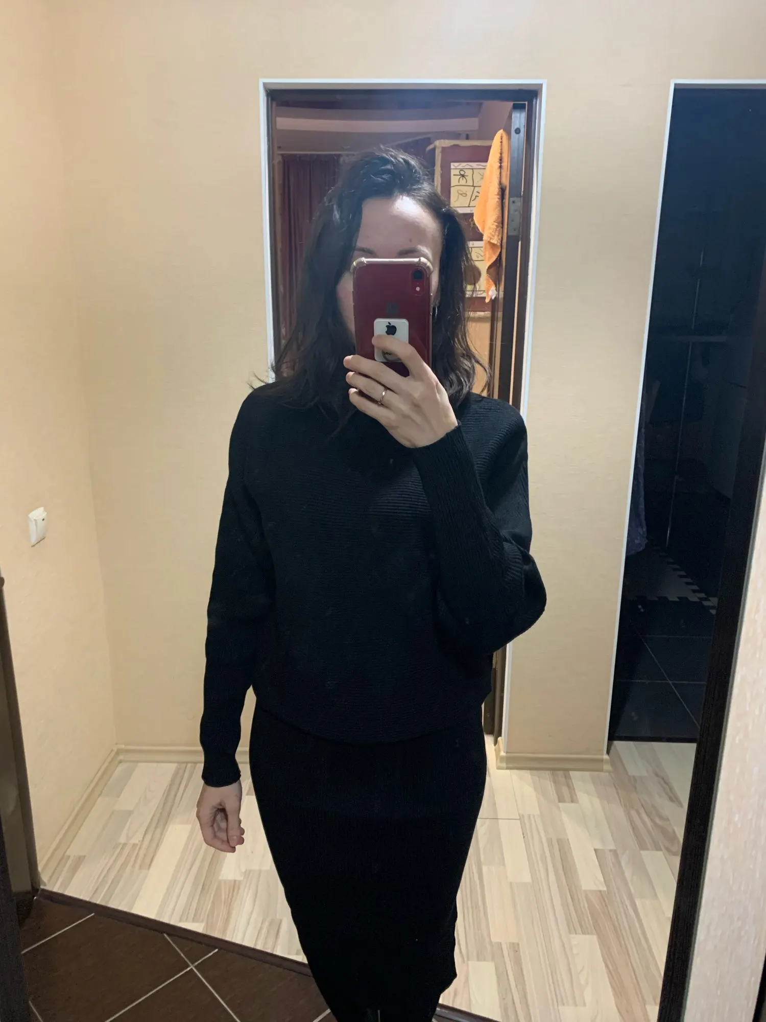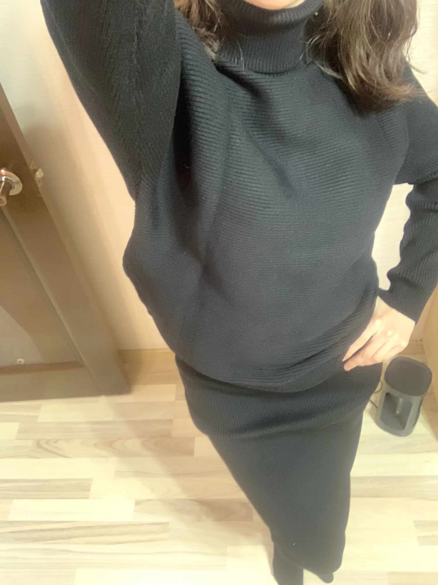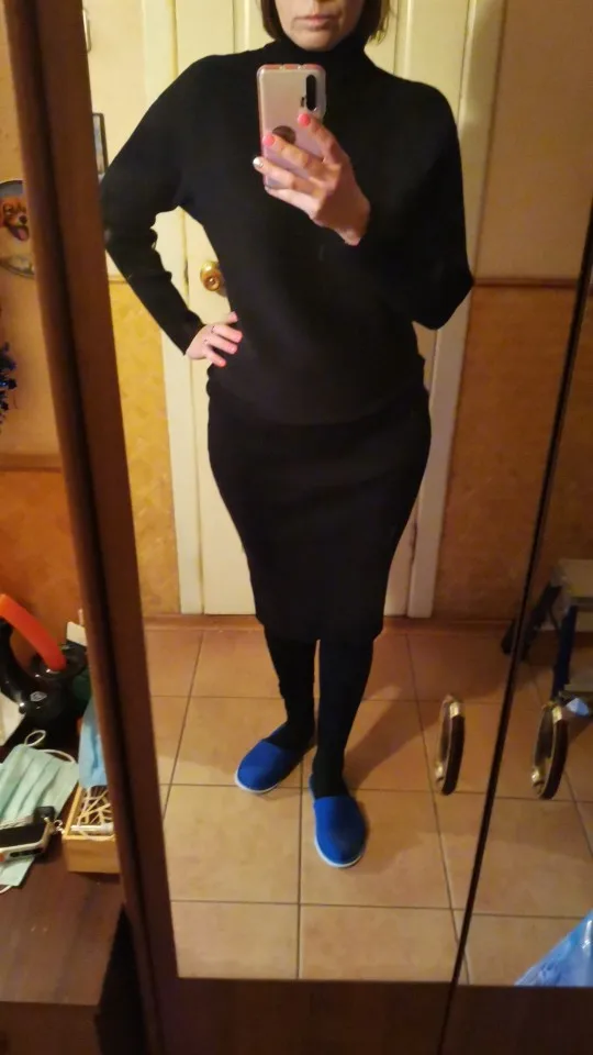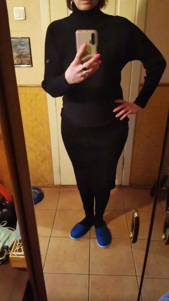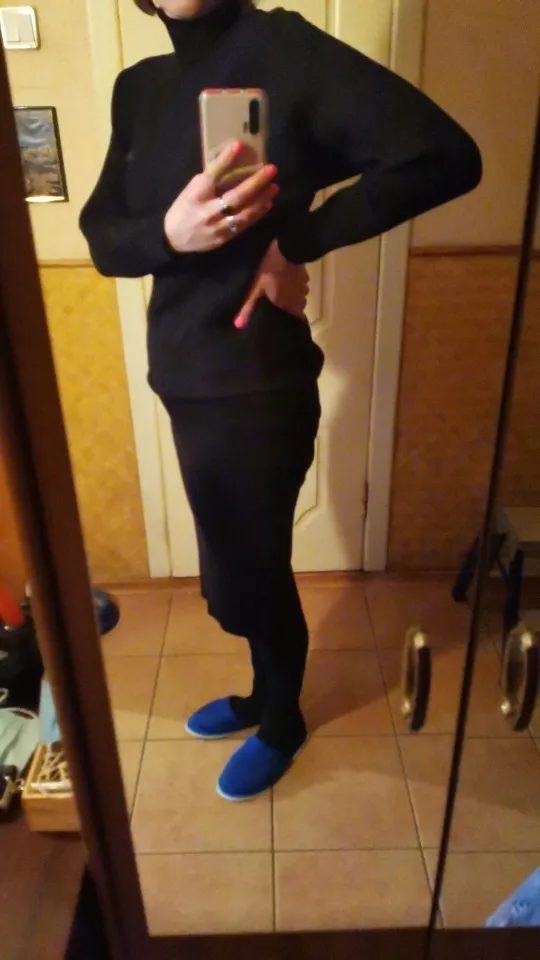 Доставка была не длительной, костюм приехал аккуратно сложенным и в полном порядке. Полотно достаточно плотное и теплое, не просвечивает, отлично тянется и садится по фигуре. Вязка - лапша. На мои объёмы 86-67-94 и рост 162 см костюм сел отлично. Сет состоит из двух предметов - свитерка, скроенного по типу "летучая мышь", и юбки в длине миди. Изюминкой выступает непосредственно вязка - на свитерке она расположено горизонтально. Юбка в обтяг, с широкой резинкой по талии и без какого-либо разреза. Ткань отлично тянется, потому разрез в принципе и не требуется. Качество вязки и пошива в норме. Костюм очень понравился