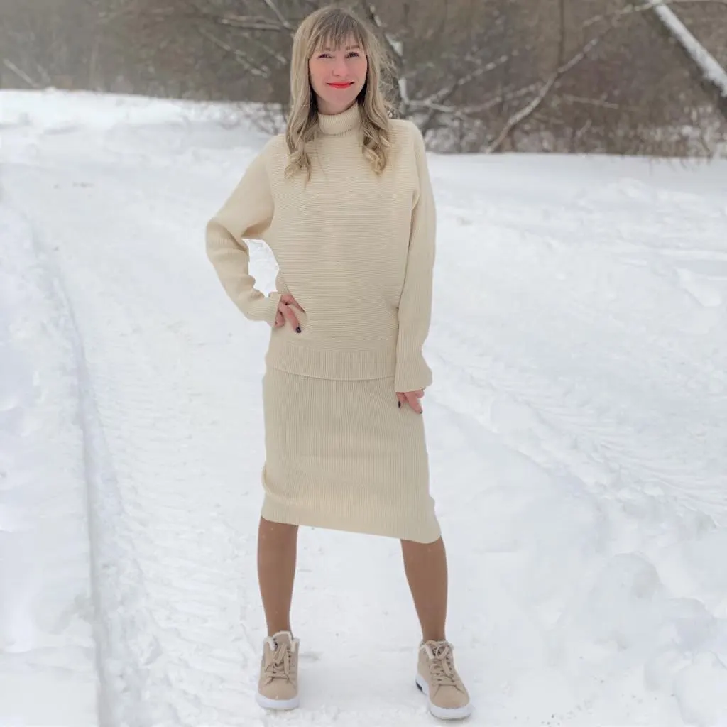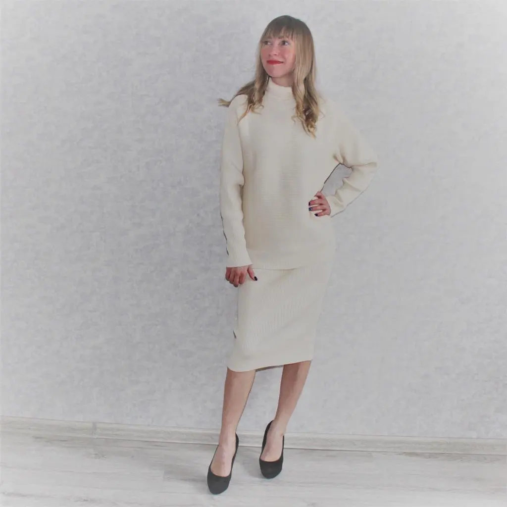 Костюмчик точ в точь как на фото у продавца, совпадение 100%, оттенок приятный, нежный, кремовый. Трикотаж плотный, хорошо тянется, пошито тоже очень аккуратно и качественно. Kачество великолепное, костюм просто не хочется снимать, он очень тёпленький, приятный к телу и смотрится шикарно, по фигуре садится идеально. Кстати, его можно носить и по отдельности комплектуя с другой одеждой, и юбка и свитер очень красивые и смотрятся выигрышно не только в сумме, на мои параметры 84 x 62 x 88 см. сел хорошо. Pекомендую, я осталась в полном восторге от этой покупки.