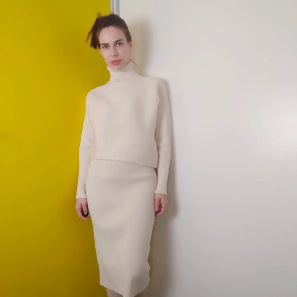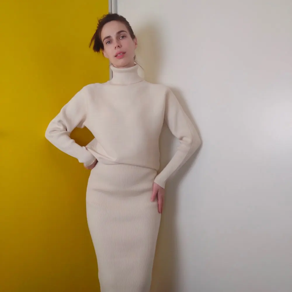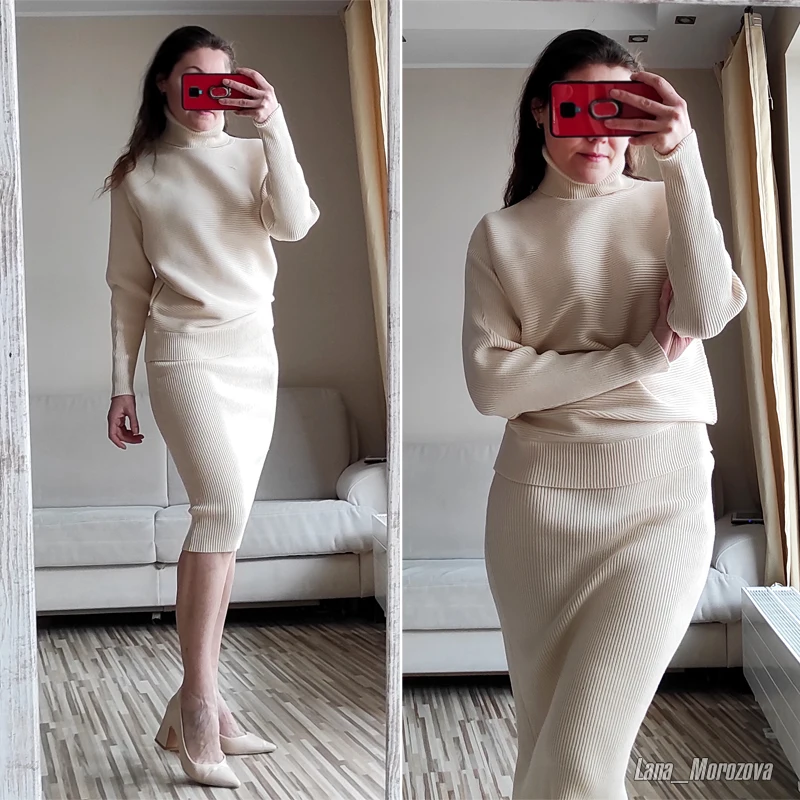 Просто шикарный трикотажный костюм! Полностью соответствует описанию. Цвет очень красивый, не желтит. Ссылка: https://s.click.aliexpress.com/e/_AD5xXG Материал плотный, приятный к телу и хорошо тянется. Свитер с рукавами «летучая мышь», горловина высокая. Юбка на резинке. Свитер Состоит из двух частей - свитер + юбка. Качество замечательное, выполнен аккуратно, строчки ровные, нитки не торчали. Преимущество такого костюма в том, что юбку и свитер можно носить отдельно, сочетая их с другими вещами. На мне единый размер, который отлично подошел. Мои параметры: 83-63-90 см, рост 164 см. Очень уютный и комфортный. Идеальный вариант на весну. Ссылка: https://s.click.aliexpress.com/e/_AD5xXG