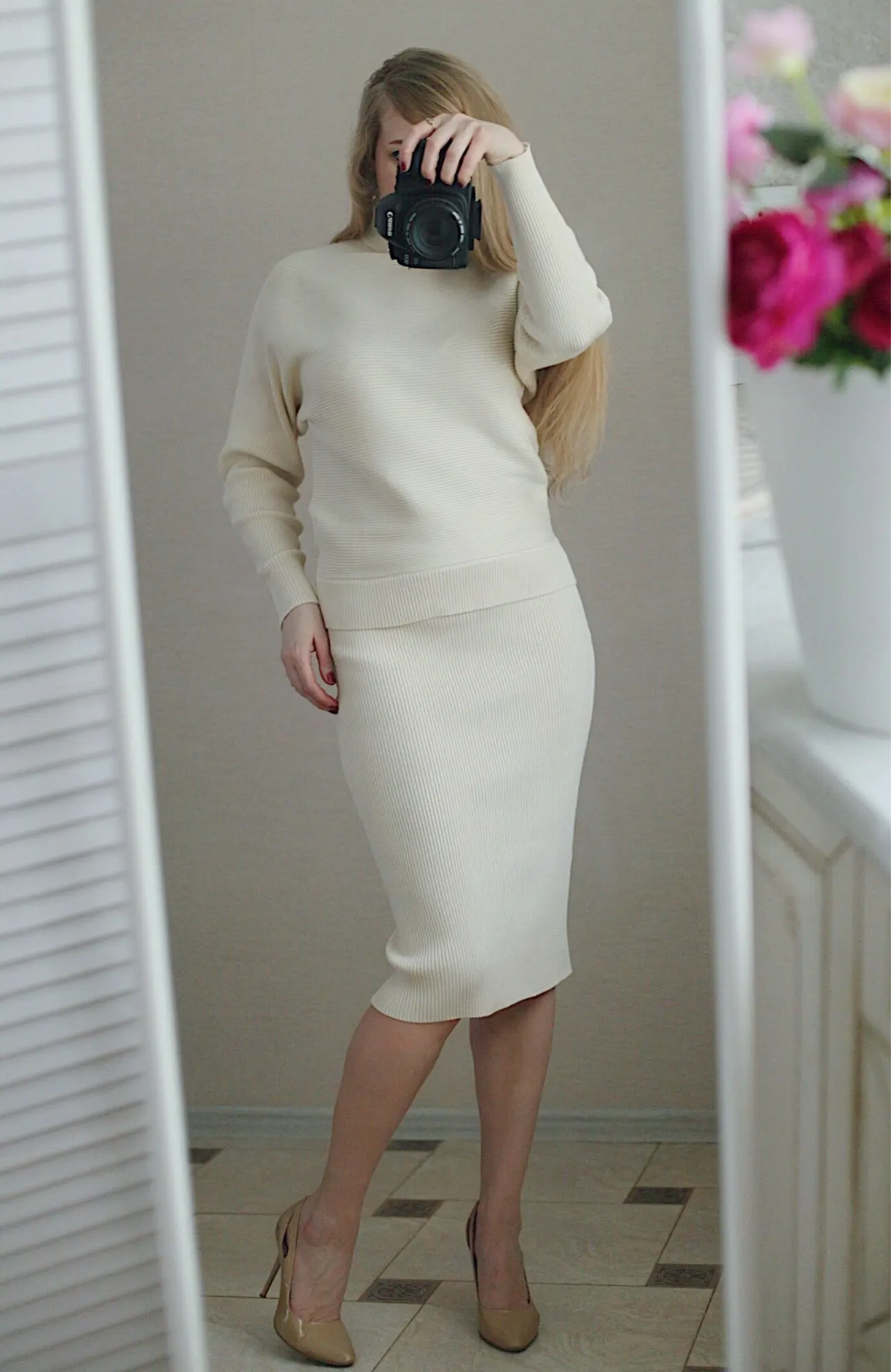 Цвет потрясающий, нежный, молочный оттенок. Я брала на весну, к коричневому тренчу хотелось посветлее. Костюм пошит качественно, швы аккуратные, вязка машинная. На счёт катышек пока не могу сказать, будут они или нет, но надеюсь, что их не будет. Представлен в едином размере. На мои параметры 93-72-100 и рост 169 подошёл отлично. Материал тянется очень хорошо, подойдёт и на параметры больше моих. Рукава джемпера модели летучая мышь. Вполне комфортные и не ярко выражены. Не любитель такого фасона, но как смотрится данный джемпер мне нравится. На мой рост длина рукава отличная, даже есть небольшой запас. Юбка на резинке. На мой рост 169 по длине чуть ниже колена, но длину можно регулировать приподнимая юбку повыше. К покупке непременно рекомендую! Такой комплект можно носить как с каблуком, так и с кедами, но мне больше понравилось с каблучком, так смотрится женственнее.