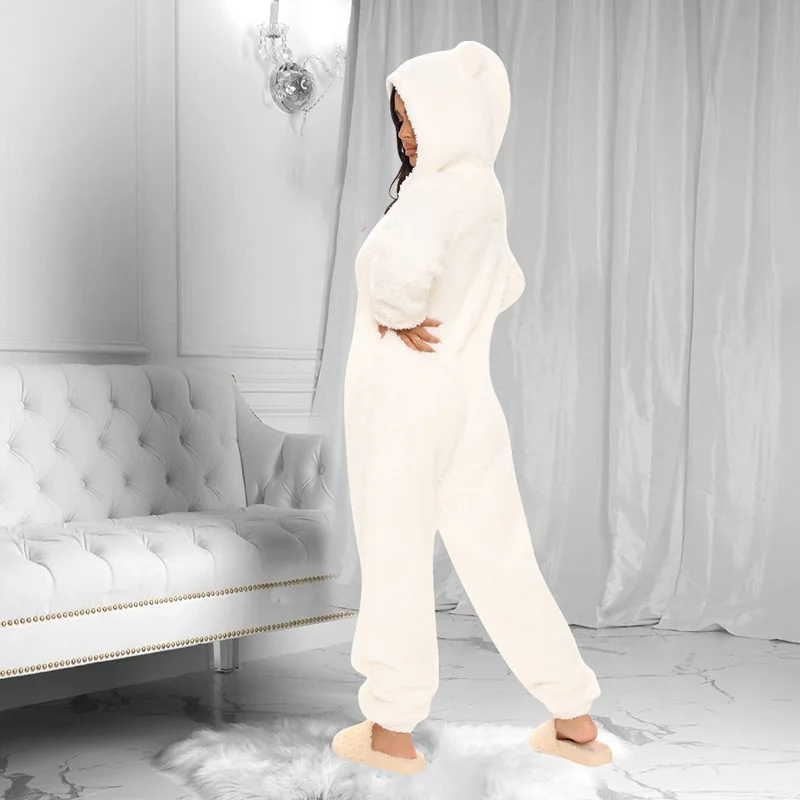 Женский Мягкий комбинезон для сна, однотонный комбинезон на молнии с длинным рукавом, шапка с ушками мультяшных животных, одежда для сна, зимний комбинезон, одежда для купания