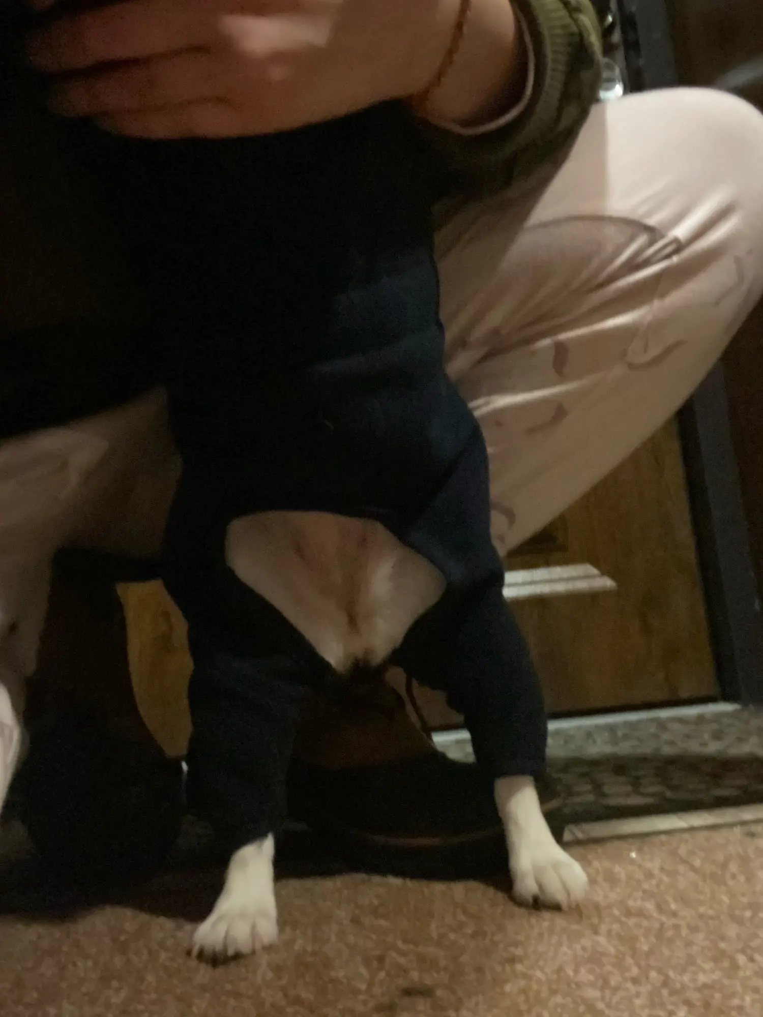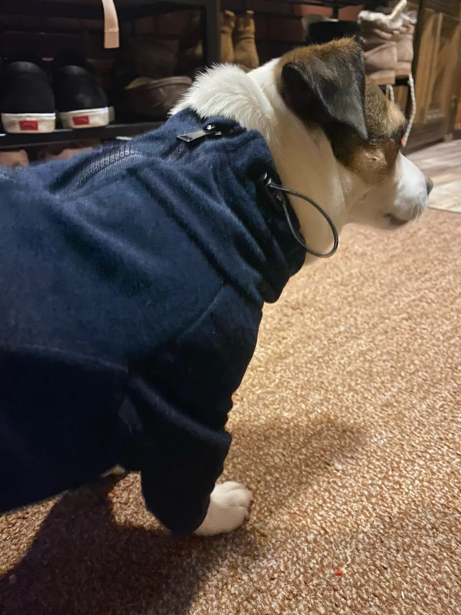 К сожалению, немного меньше, чем у моих собак сзади, его ноги не совсем подходили к рукавам. Но это очень красивая куртка, красивая и теплая флисовая ткань.