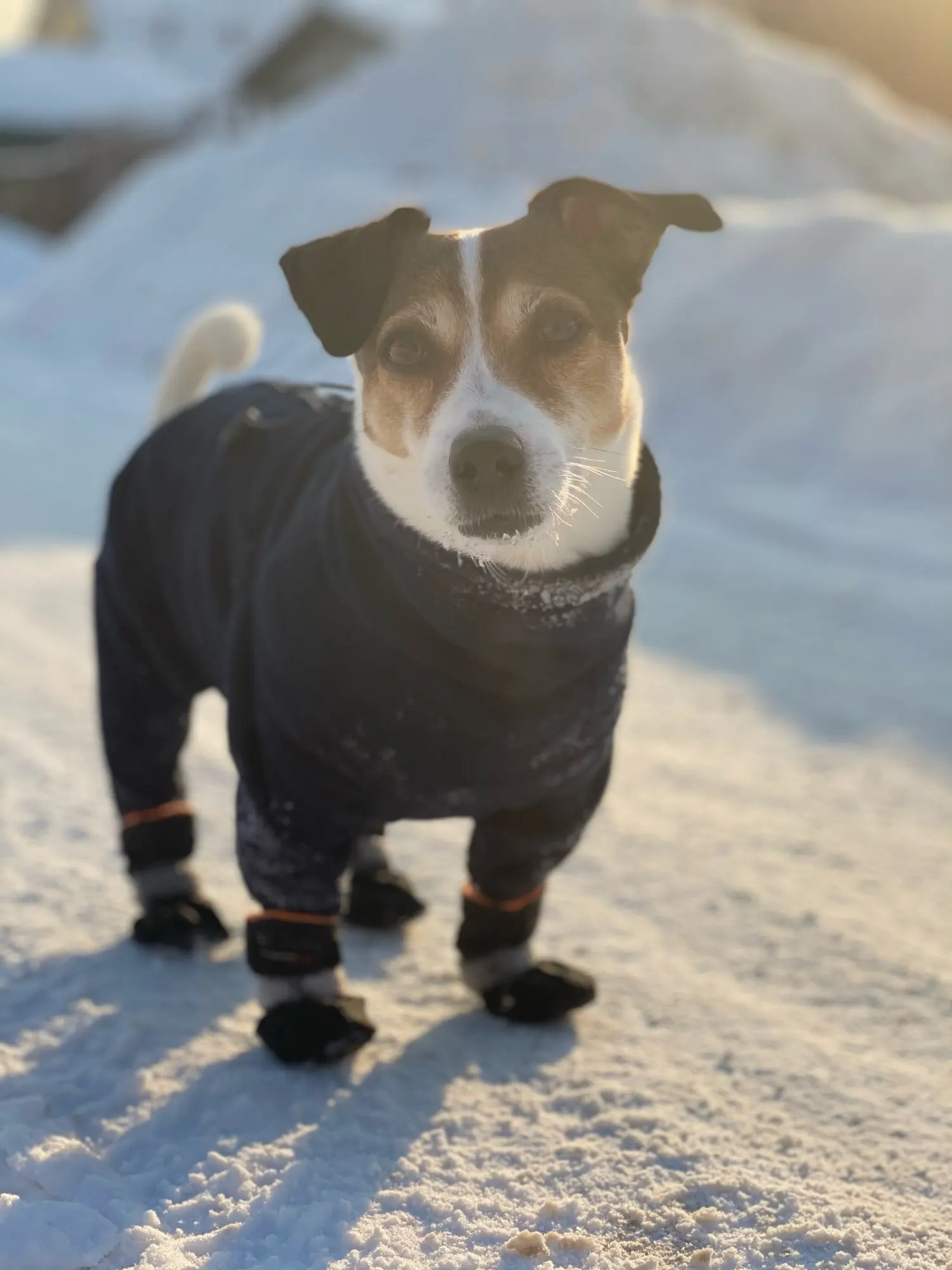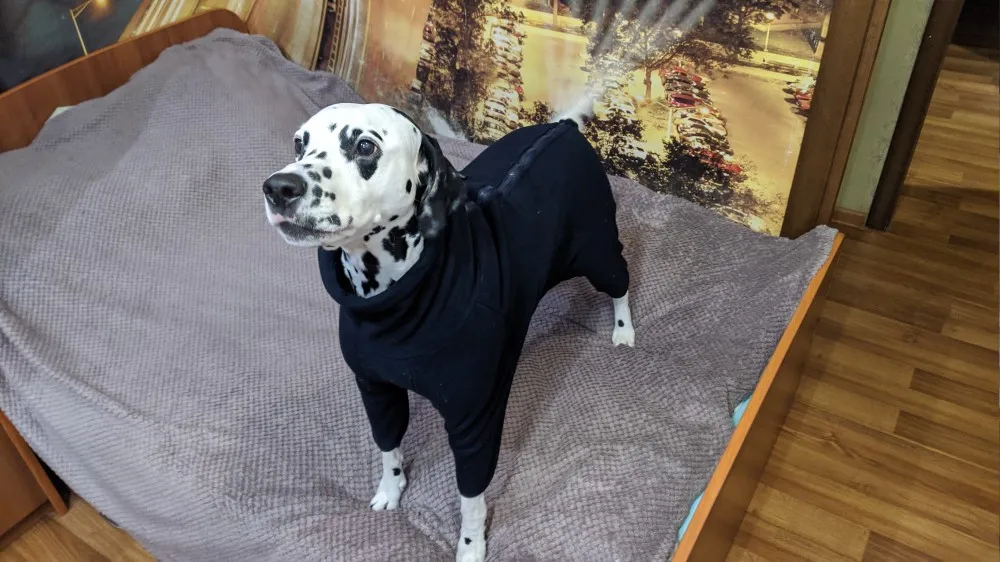 Отличный комбез! Брала по размерной сетке, подошёл почти идеально. Немного туговато в районе хвоста, но собака носится в нем как угорелая, по этому думаю ей ок. Лапы не выпадают, собака тёплая в нем! Для девочек почти полностью закрыто пузо! Мальчикам можно просто отпороть кружок