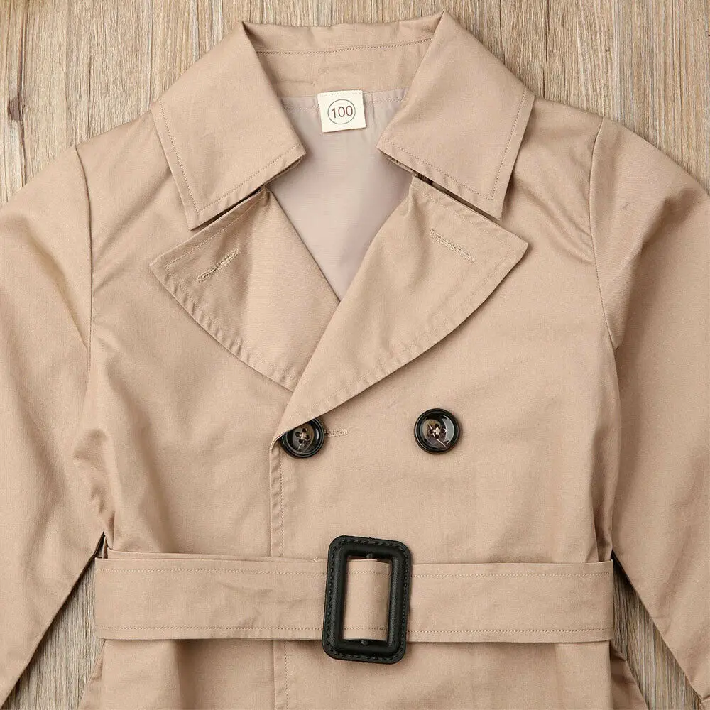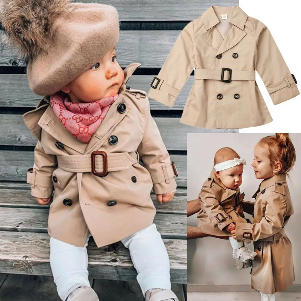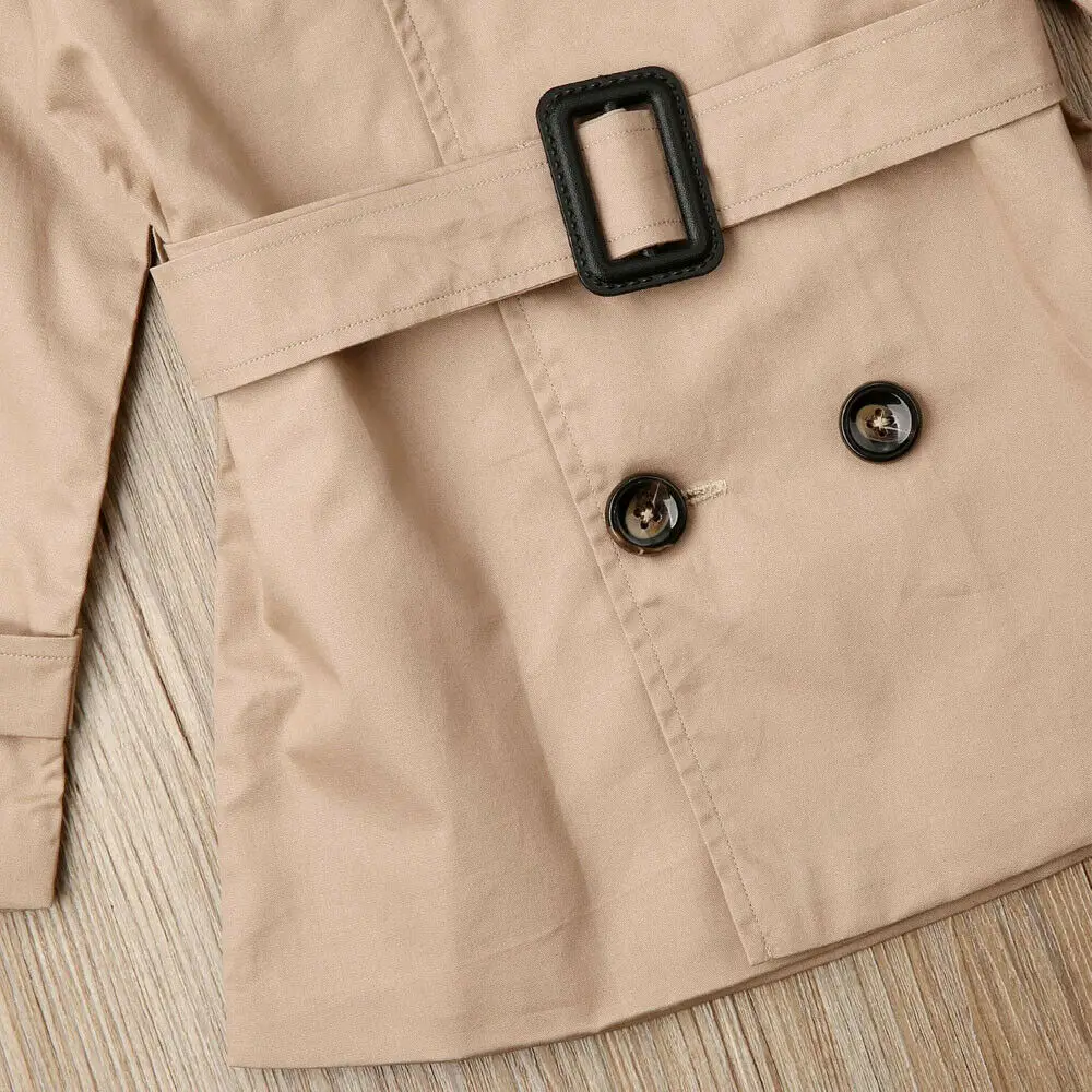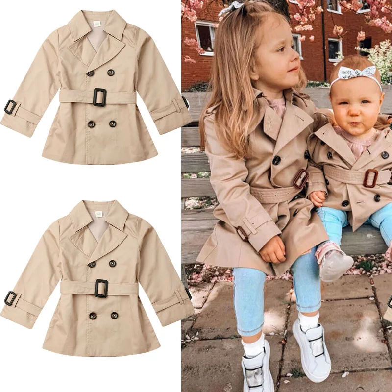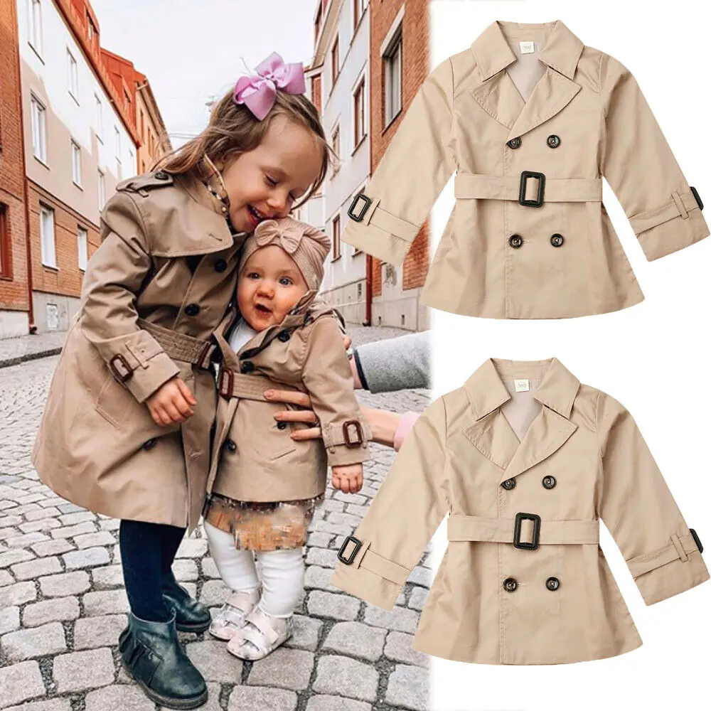 Осенняя одежда для маленьких детей для девочек, Тренч с лацканами для детей цвета хаки с длинным рукавом Куртка на подкладке Тренч верхняя одежда с поясом для 2-7Years мода на каждый день