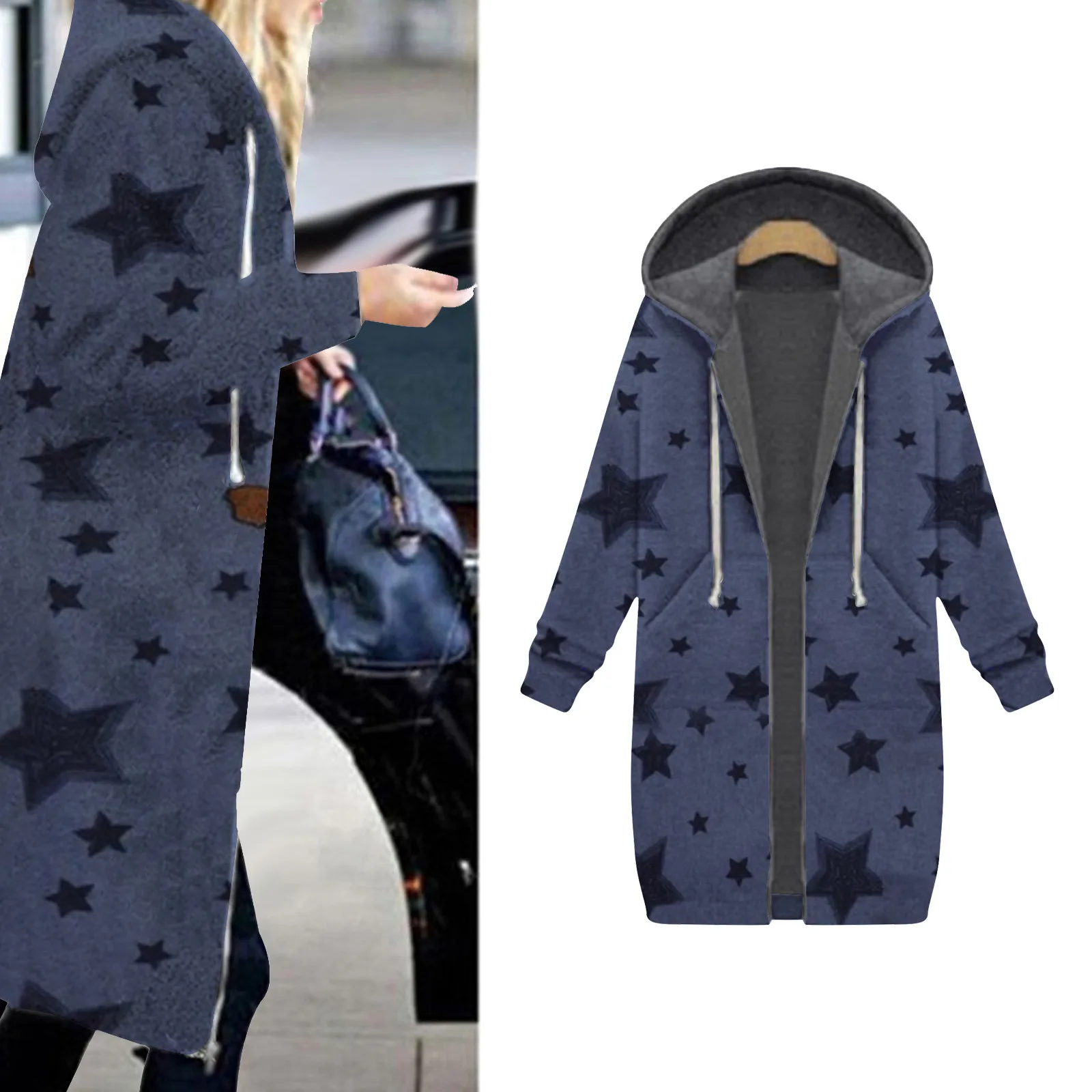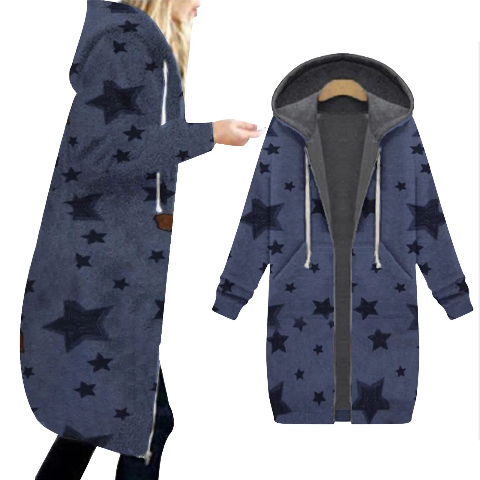 Женская зимняя куртка, длинный зимний флисовый теплый кардиган, модная куртка с капюшоном и длинным рукавом, на молнии, пальто с принтом звезды, пальто женское # Z