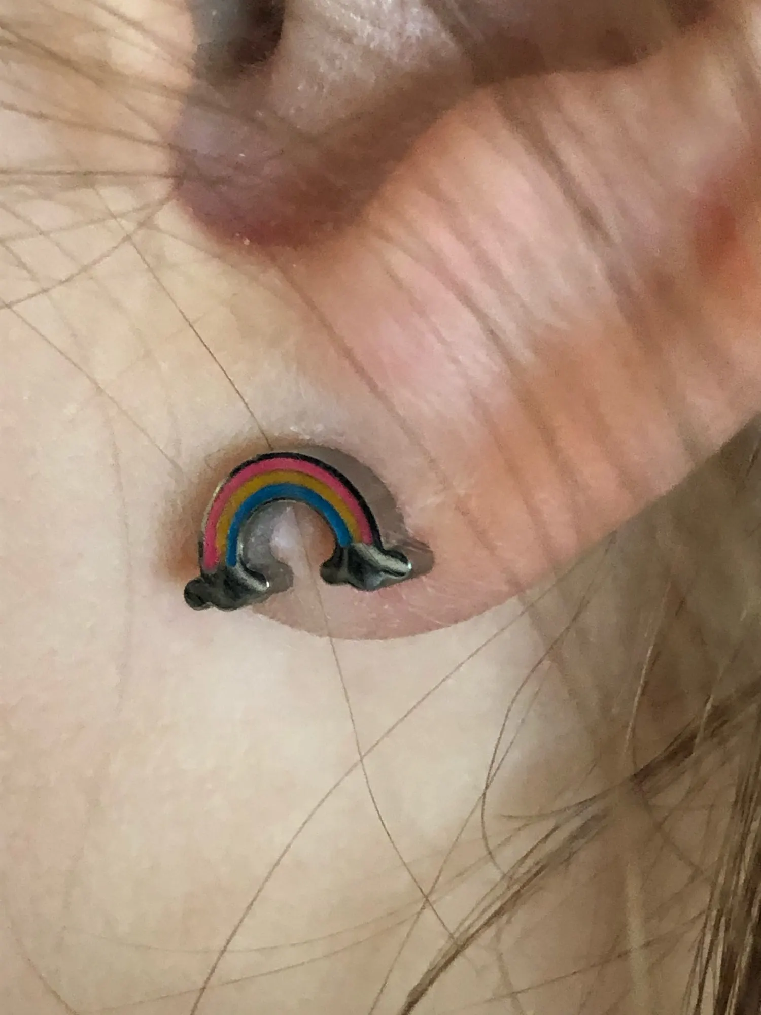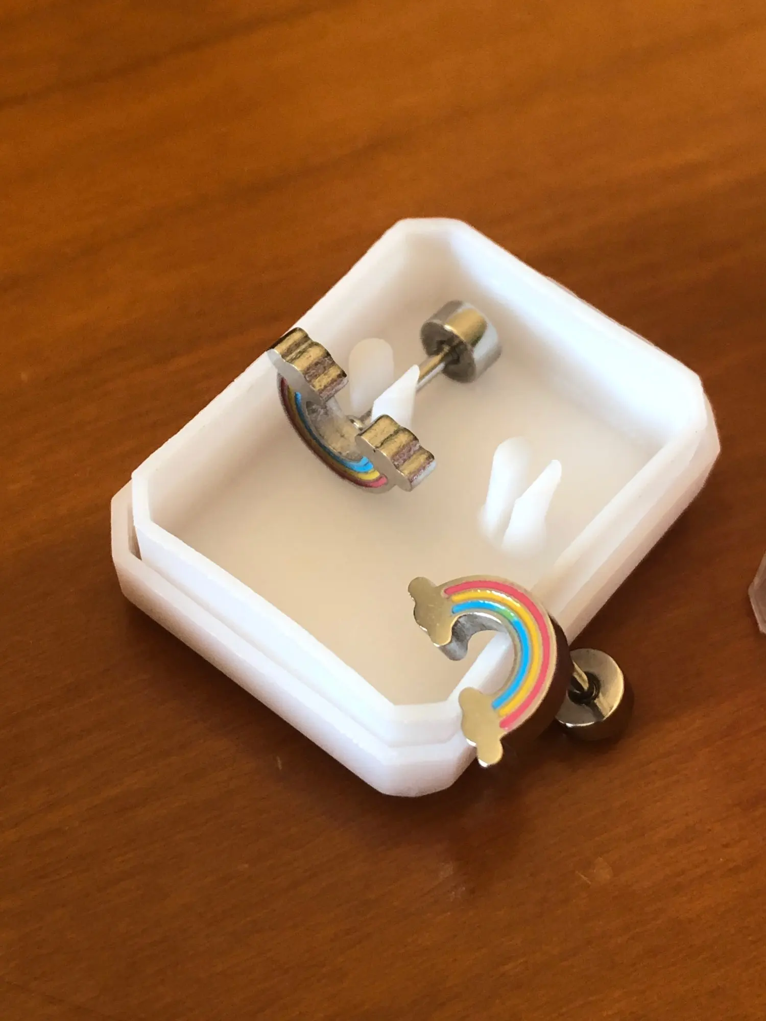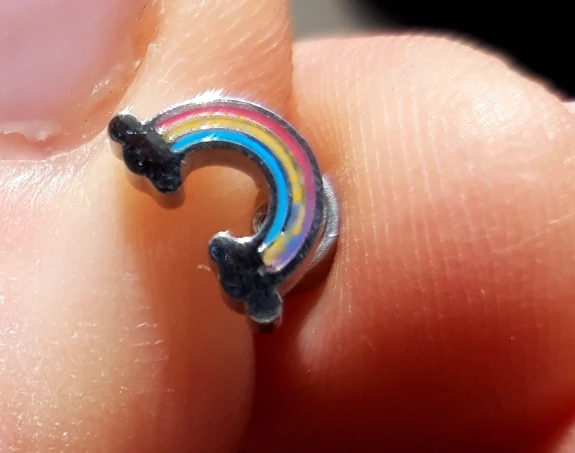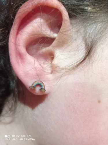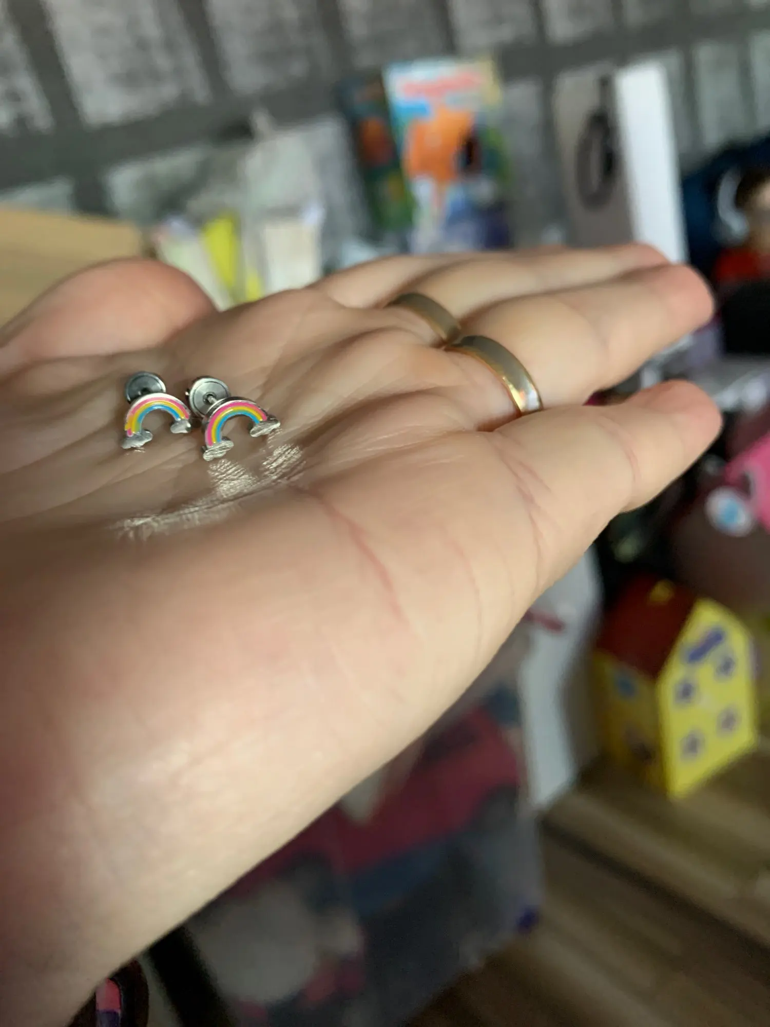 Мне не понравились серьги. Сам материал не блестящий, как будто уже потемневшие, местами шершавый. Застежка сидит не плотно, шатается. Радуга прокрашена не аккуратно. Края радуги немного острые. Ну к стоимости претензий нет. Но больше не закажу