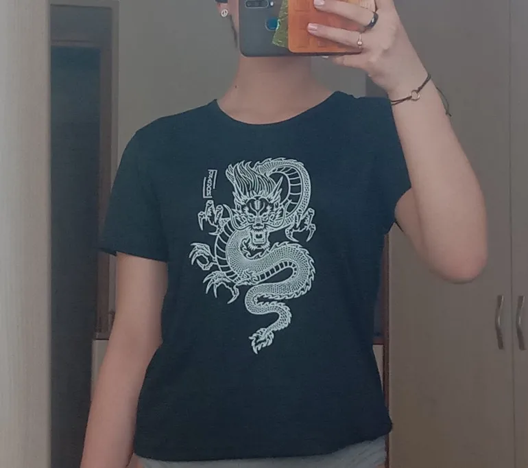 футболка хорошая, качество конечно не поровдало себя, но за такую цену в полне хорошо. Футболка достаточно хорошая, по швам вопросов нет. Но она просвечивает если просто её направить на какой либо свет не надевая её, но на себе нечего не просвечивает даже со светлым топом. Когда открывали картинка склеилась с другой стороной, без неприятностей, но чувство было что сейчас такая разорвется, лучше отрывть медленно! Доставлялась очень долго т.к футболка оказалась на другой почте и доставлялась на другую почту где-то 6-9 дней.