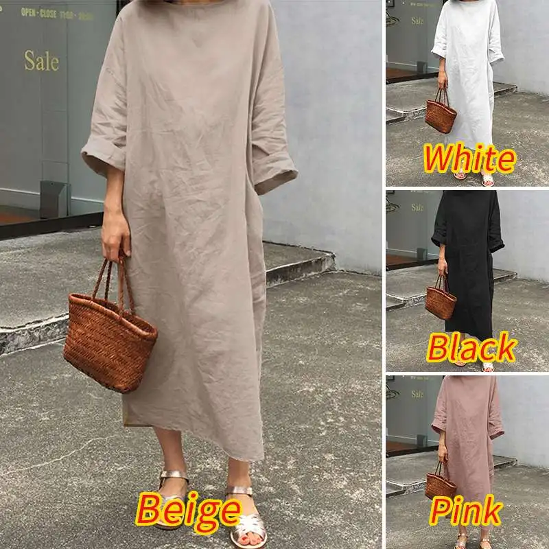 Платье ZANZEA женское с круглым вырезом, хлопково-льняное повседневное элегантное однотонное вечернее, с длинным рукавом, сарафан, кафтан, на весну